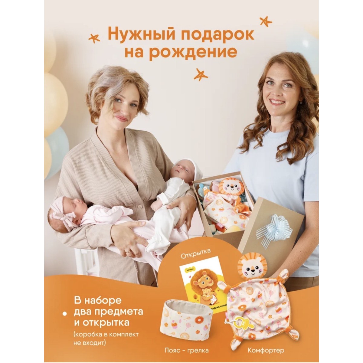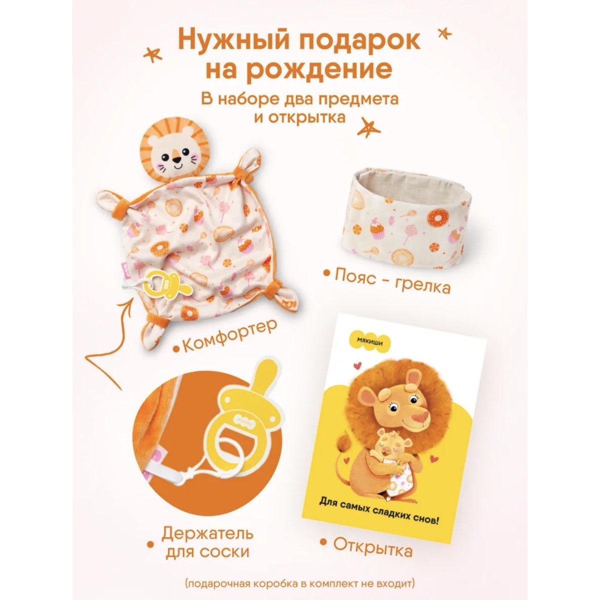 Игровой набор комфортер с держателем для соски и пояс-разогрелка для новорожденных - новинка от бренда "Мякиши". Такой чудесный комплект станет отличным подарком на рождение, крестины и просто так без повода. В комплекте идет милая открытка, что делает набор праздничным.