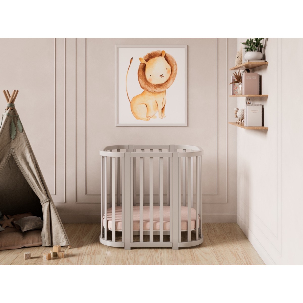 Далее кроватка трансформируется в овальную со спальным местом 120*60 см. Модель имеет современную овальную форму. Овальная форма кроватки предназначена для детей от года до четырех лет.