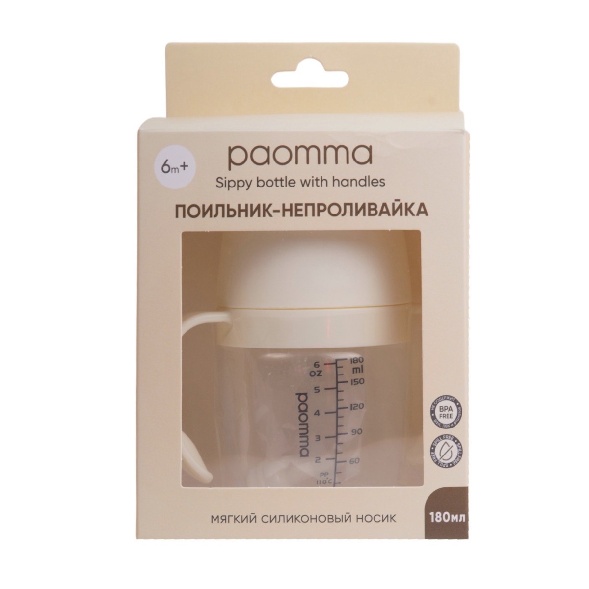 Поильник-непроливайка paomma с силиконовым носиком (6+ мес на 180 мл) создан для удобного и безопасного обучения малыша самостоятельному питью. Силиконовый носик выполнен из мягкого и прочного силикона, устойчив к укусам, не травмирует зубы и десны. Бутылочка, крышка и ручки изготовлены из безопасного полипропилена (пищевого пластика) и не содержит BPA. Двойной клапан регулирует скорость потока и защищает от проливания и захлебывания. Антиколиковая система снижает риск колик и газиков, предотвращая обратный поток жидкости. Съемные ручки с изогнутой формой обеспечивают надежный захват и помогают развивать навык самостоятельного питья. Герметичная крышка поильника плотно закрывается и защищает носик от загрязнений и сохраняет гигиеничность. Поильник-непроливайка paomma имеет минимум деталей: легко собирается и разбирается. Его можно кипятить, стерилизовать и мыть в посудомоечной машине.