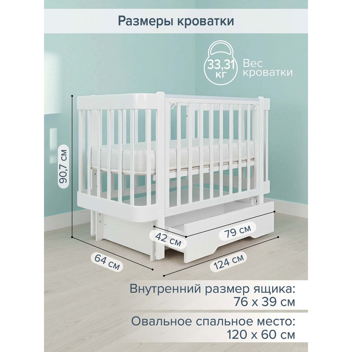 -Ложе кроватки имеет 4 положения по высоте: от пола (25 см±1 см; 34 см±1-2 см; 40,5 см±1-2 см; 47 см±1-2 см).