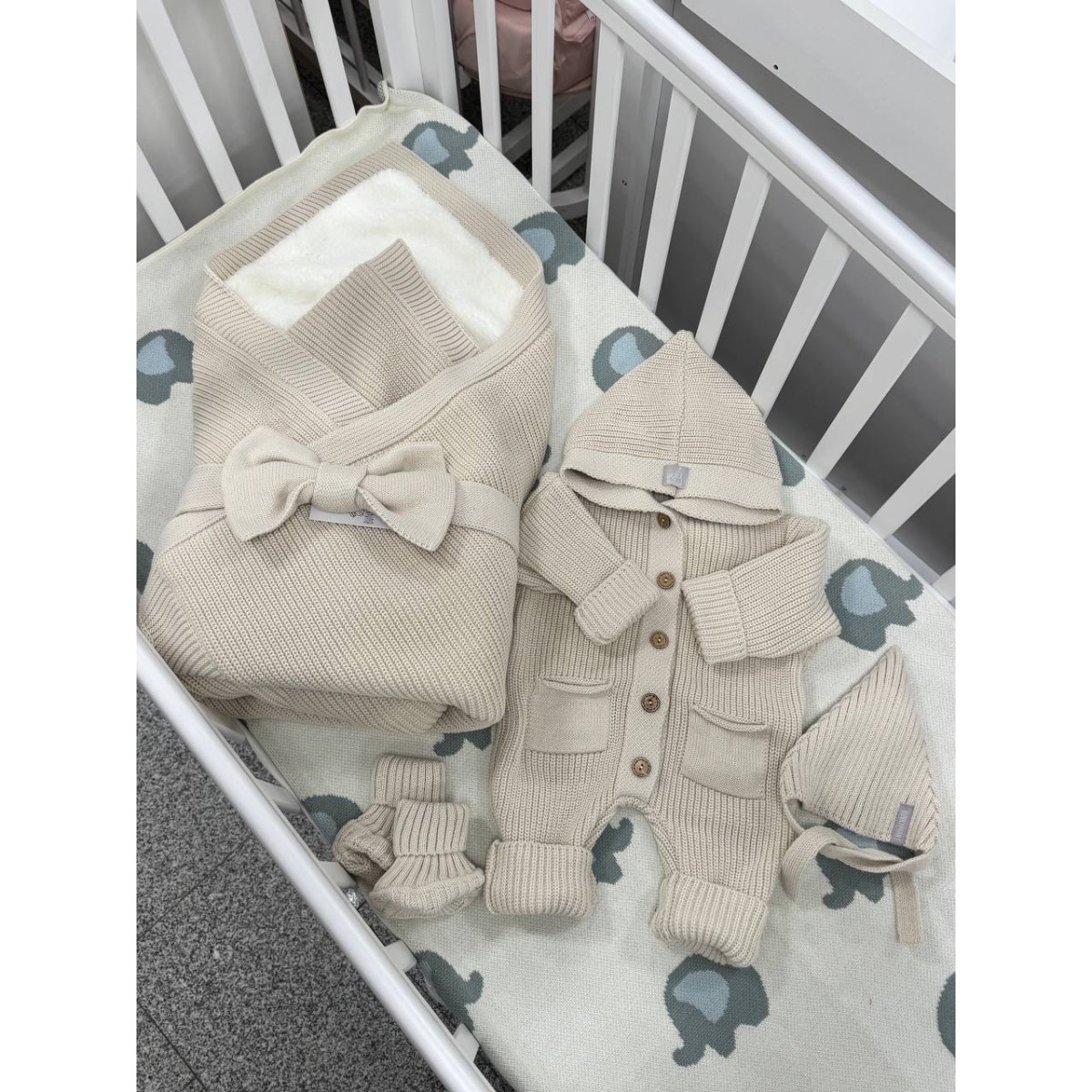 Комплект- палочка выручалочка . В нем все продумано, вязаный пледик утеплен мягкой шерпой. В комплекте есть все, что можно использовать на выписку, а после все товары из комплекта используются на прогулки и каждый день