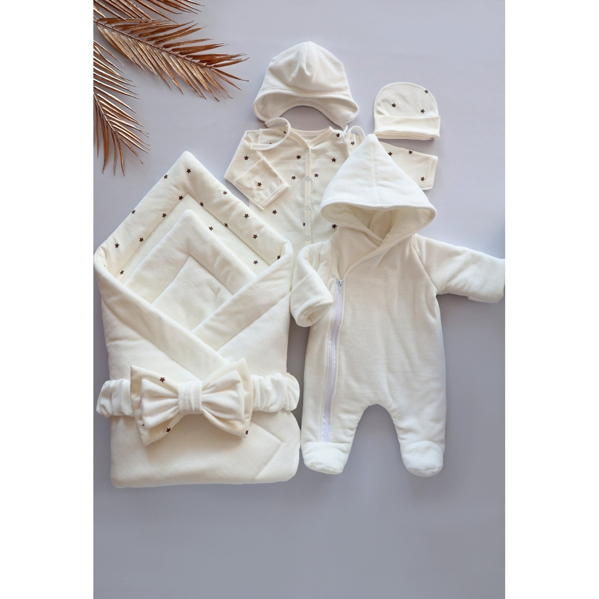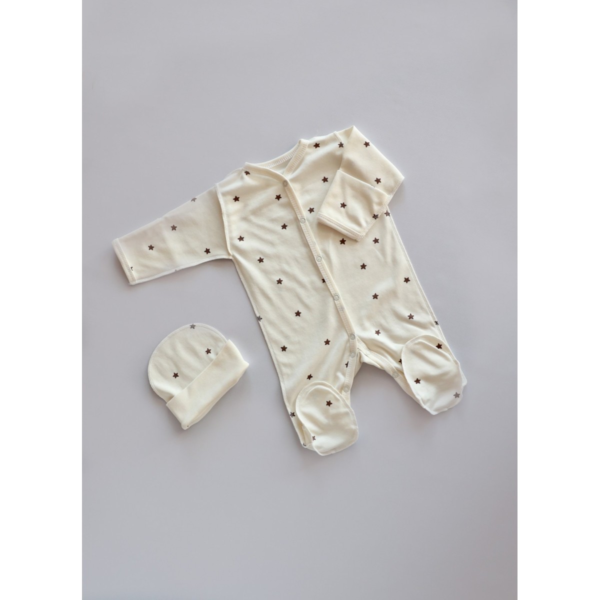 Комплект на выписку из роддома 6 предметов Bunnyphant цвет: молочный + звездочки монохром 0321