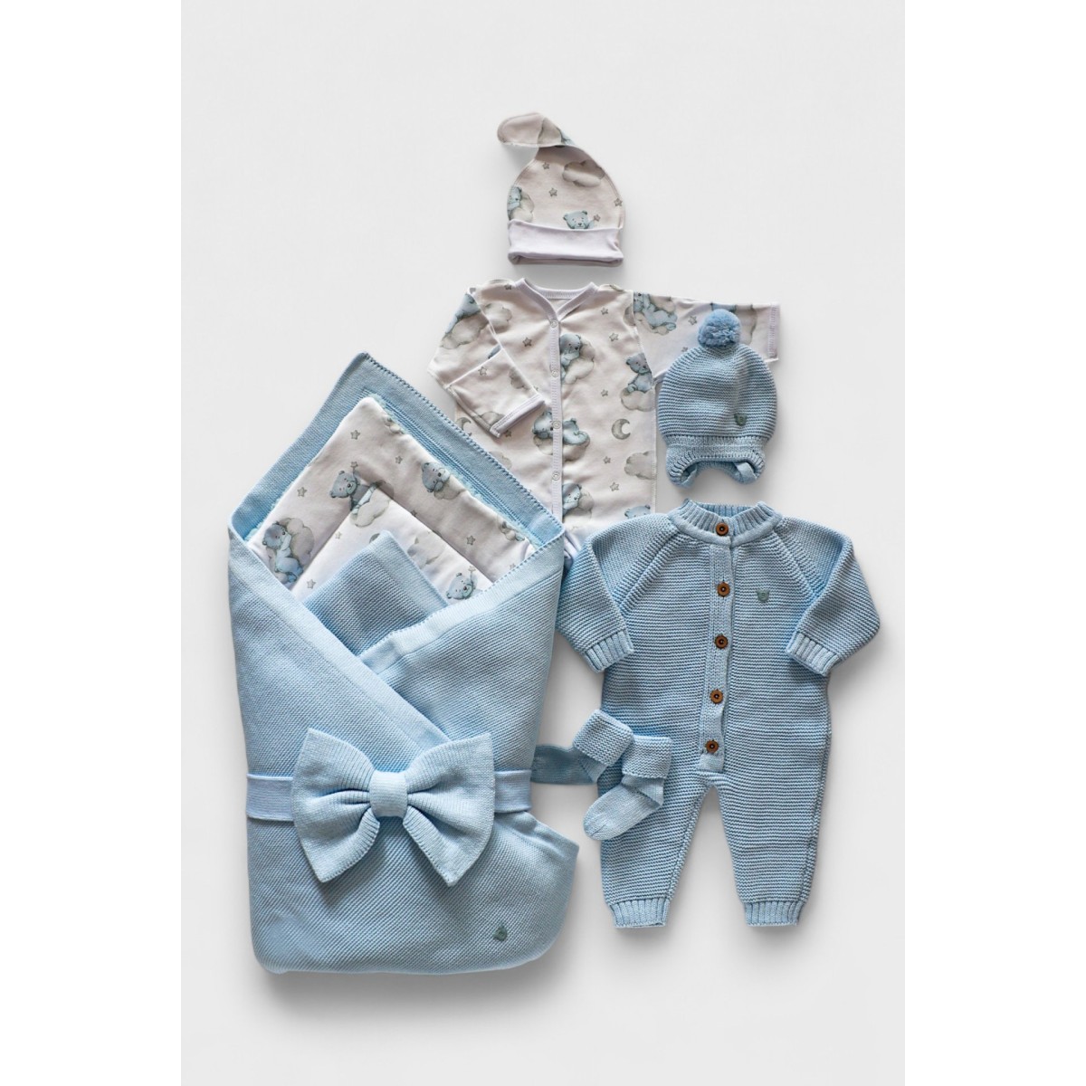 Комплект на выписку из роддома 8 предметов "ALPACA" цвет: нежно-голубой / мишки на облаках 0363