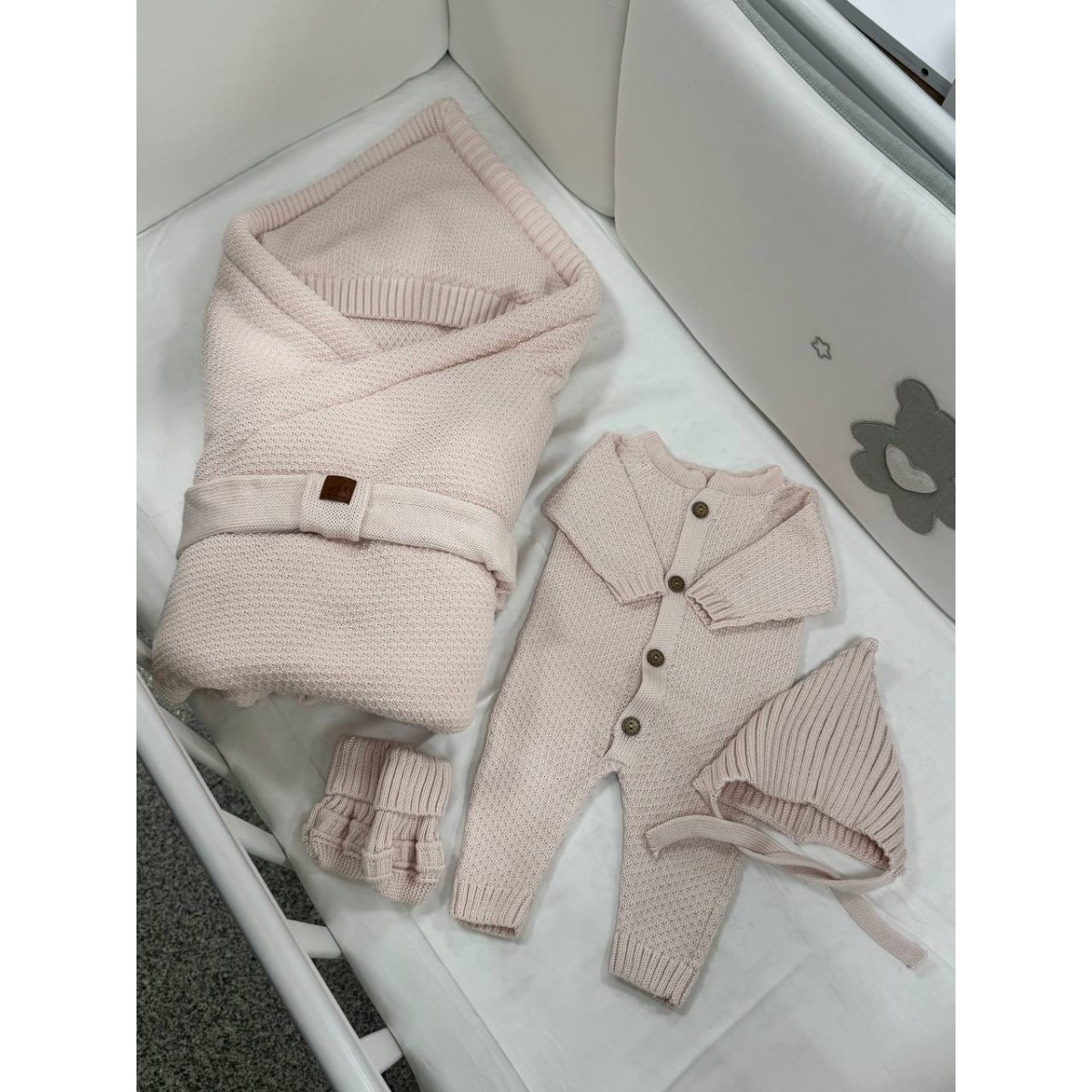 Комплект- палочка выручалочка . В нем все продумано. Теплый красивый вязаный конвертик на трикотажной подкладке, утепленный термофином, согреет малыша на выписке и прогулках. Для второго слоя в комплекте есть вязанный комбинезончик с пинеточками и милейшая шапочка-гномик. Останется добавить первый ( нательный) слой , его также можно приобрести в нашем магазине.