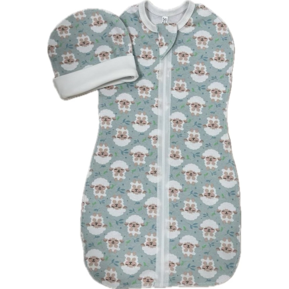 Пеленка-кокон на молнии с шапочкой 50-56 см принт: барашки на ментол Т-007