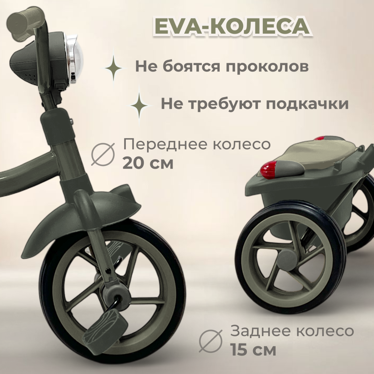 -Диаметр колёс: переднее — 20 см, задние — 15 см