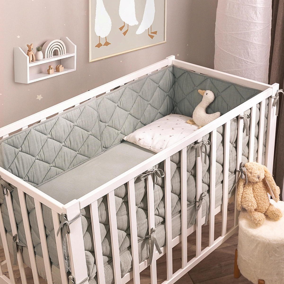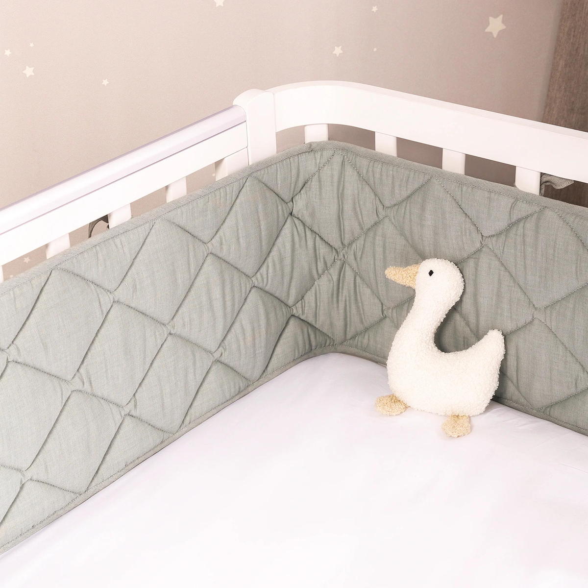 Стеганая структура делает бортики плотными и упругими, но при этом гибкими, чтобы легко принять нужную форму по периметру кроватки. Они хорошо защищают малыша от сквозняков, застреваний, случайных ударов и создают уютную атмосферу для спокойного сна.