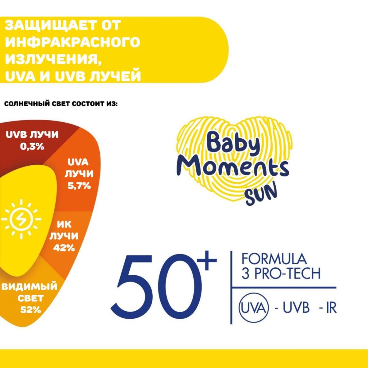Формула солнцезащитного спрея Baby Moments SUN не содержит оксибензона и октиноксата, которые негативно воздействуют на морскую экосистему и часто встречаются в солнцезащитных средствах, а также ароматизаторов и спирта.