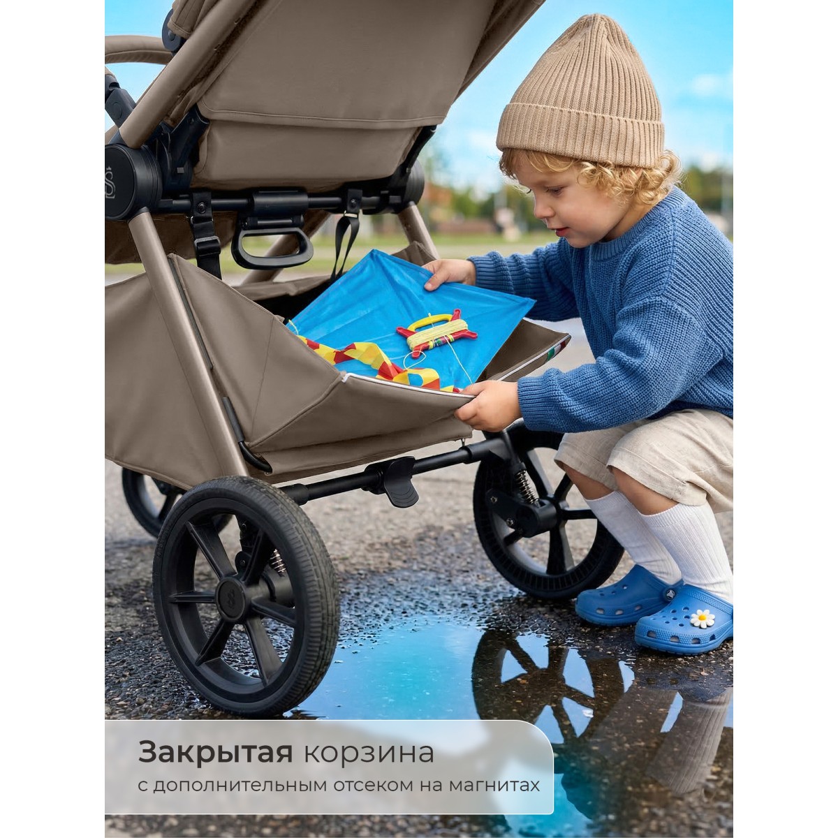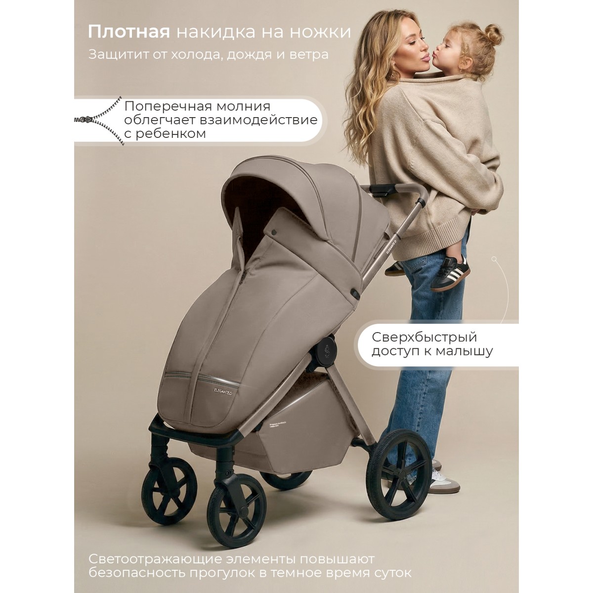 В комплекте все необходимое: москитная сетка, накидка на ножки, подстаканник, сумка для мамы.