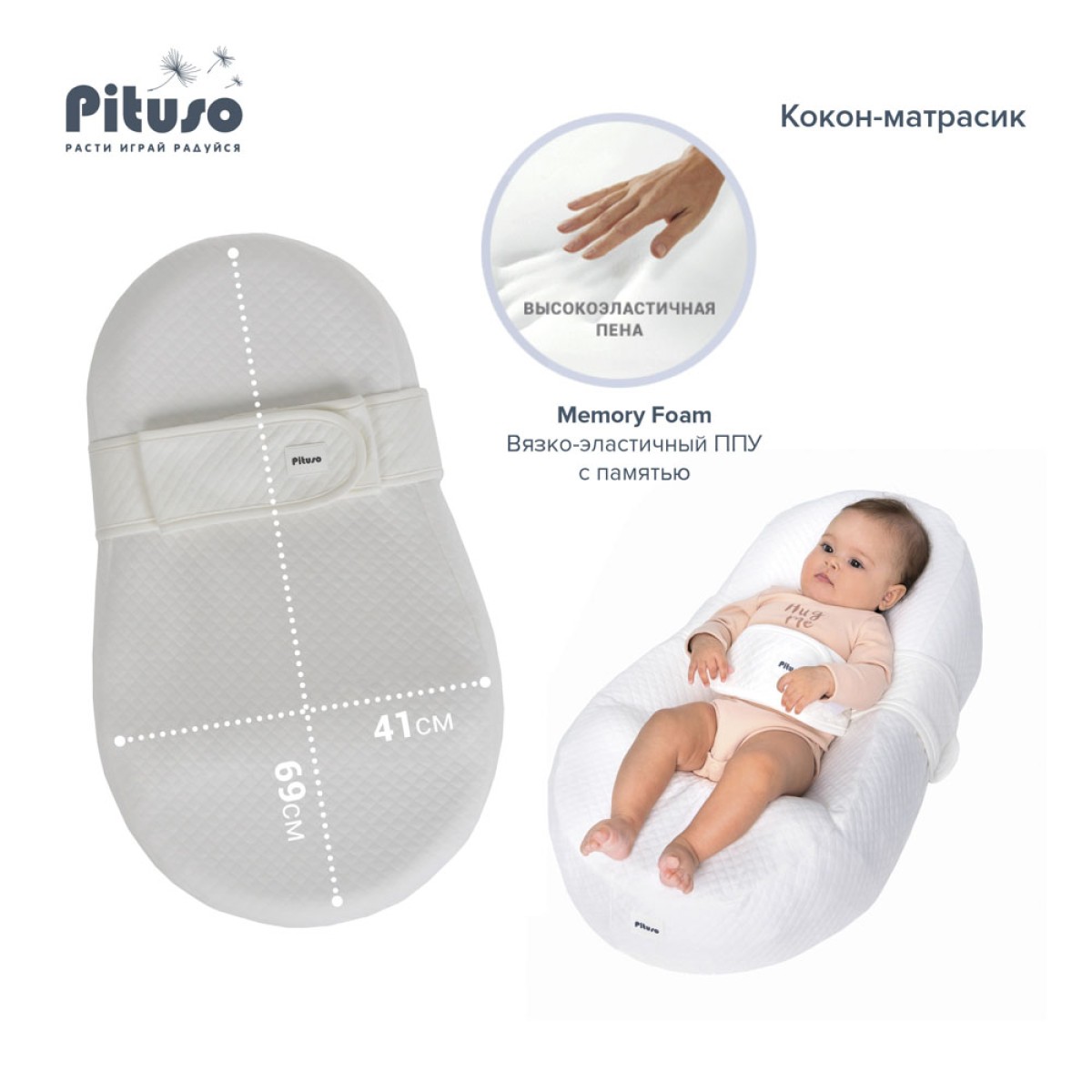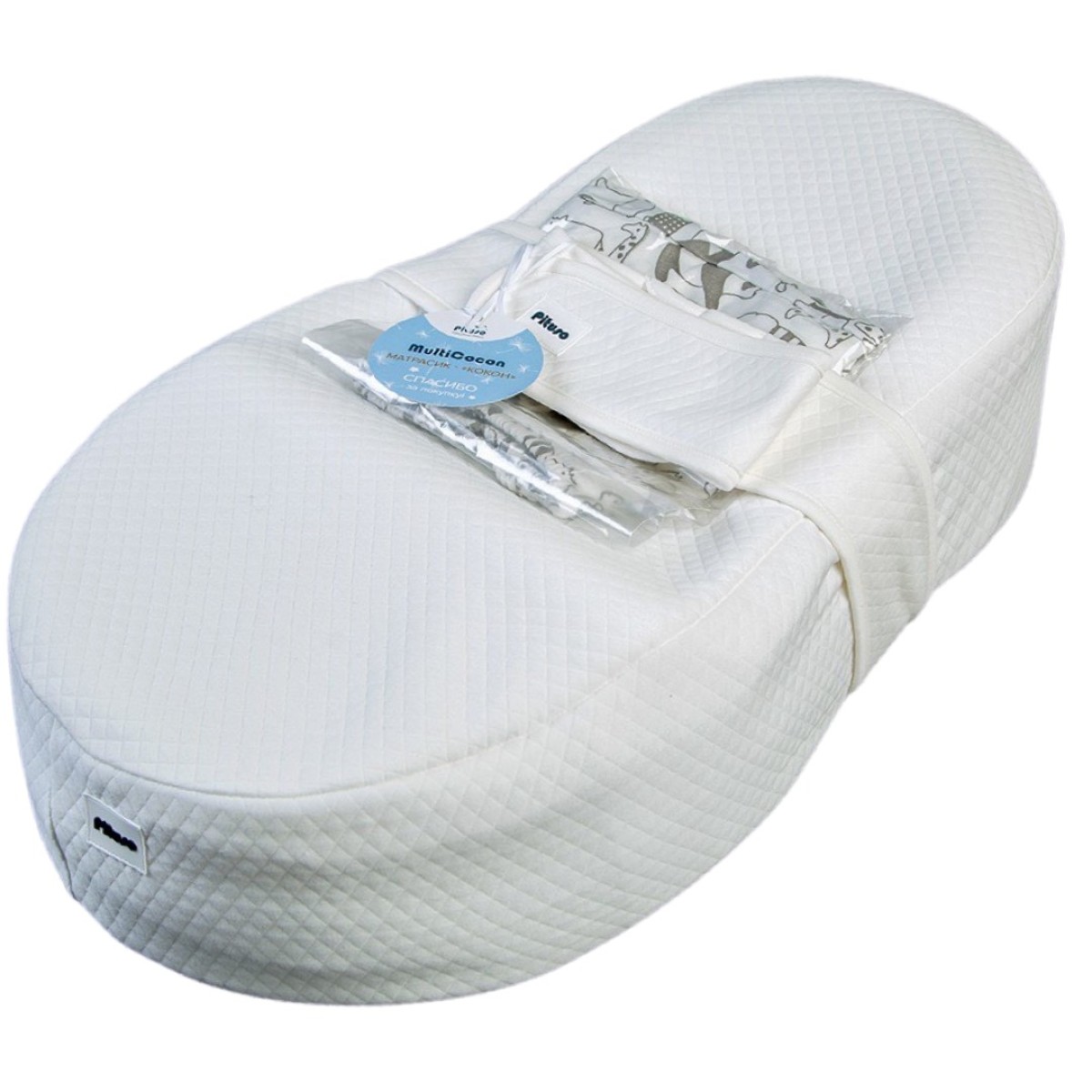 Комплектация: Основание колыбели-кокона из эластичного пенополиуретана; Два съемных чехла на резинке – плотный и трикотажный; Непромокаемый чехол на молнии; Валик под ножки; Пояс с липучками; Сумка-переноска.