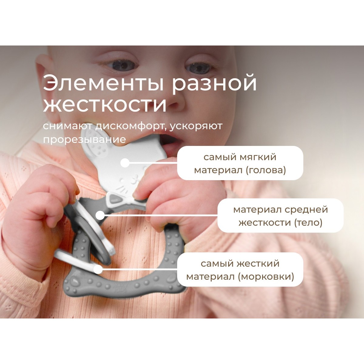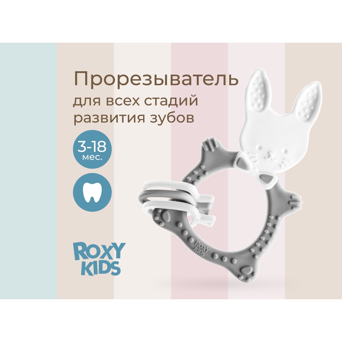 Прорезыватель для зубов BUNNY TEETHER подходит для всех стадий прорезывания зубов у малышей. Он состоит из элементов различной степени жесткости, что позволяет малышу использовать на протяжении всего времени прорезывания. На начальном этапе, когда у малыша раздражены десны, он может чесать их о мягкую рельефную голову зайчика. На завершающем этапе малыш сможет грызть более твердое тело и твердые морковки для лучшего эффекта. BUNNY TEETHER пригодится даже при прорезывания жевательных зубов, потому что ушки зайца по форме похожи на капу, что позволит малышу снять зуд с самых дальних десен. Прорезыватель сделан из безопасных гипоаллергенных материалов (термоэластопласта и полипропилена), так что ребенок может грызть его целыми днями. Еще одна отличительная особенность BUNNY TEETHER это тело, сделанное в форме кольца, которое малыш сможет удобно держать. В ассортименте ROXY-KIDS прорезыватели BUNNY TEETHER представлены в нескольких цветах. Соответствует стандартам безопасности товаров для детей.