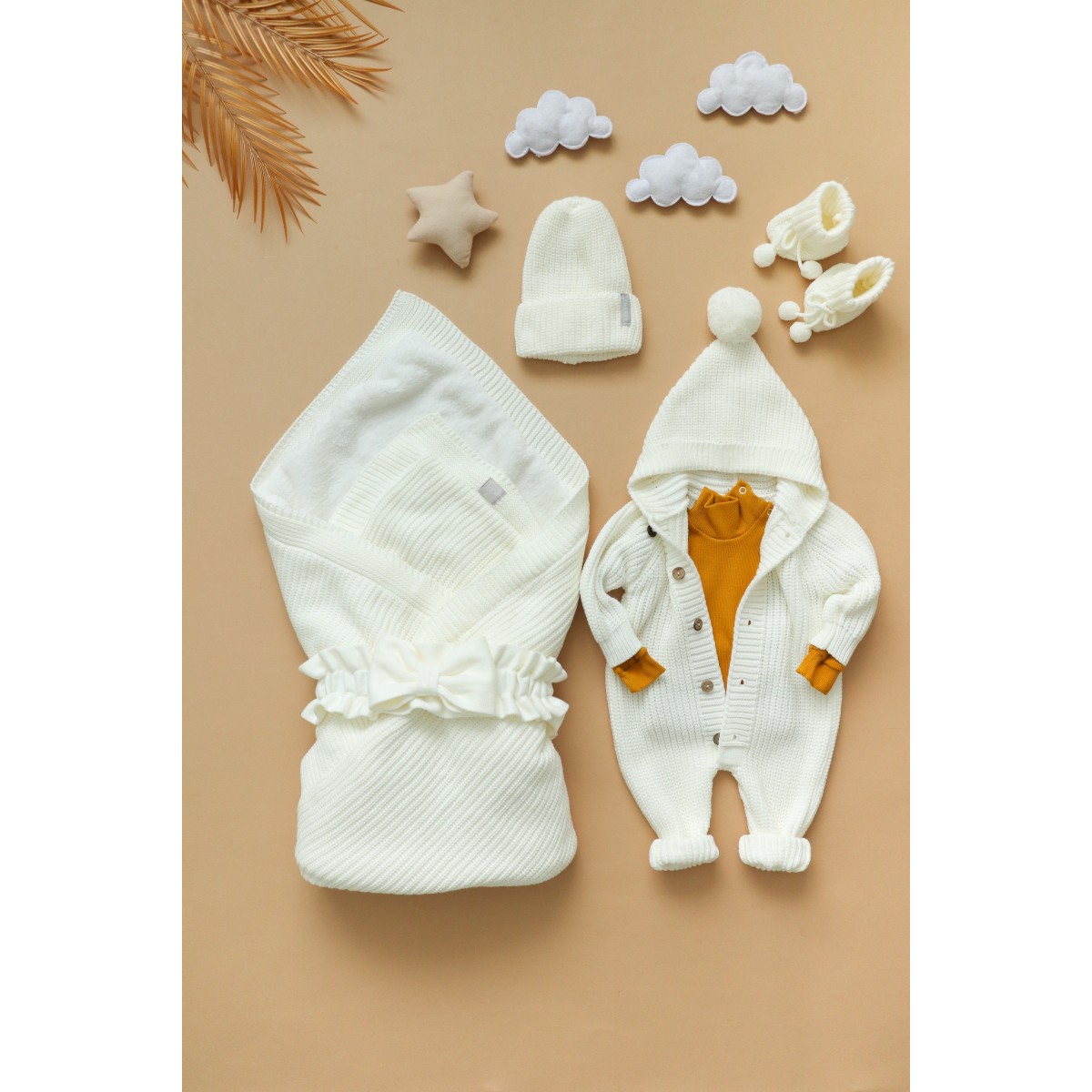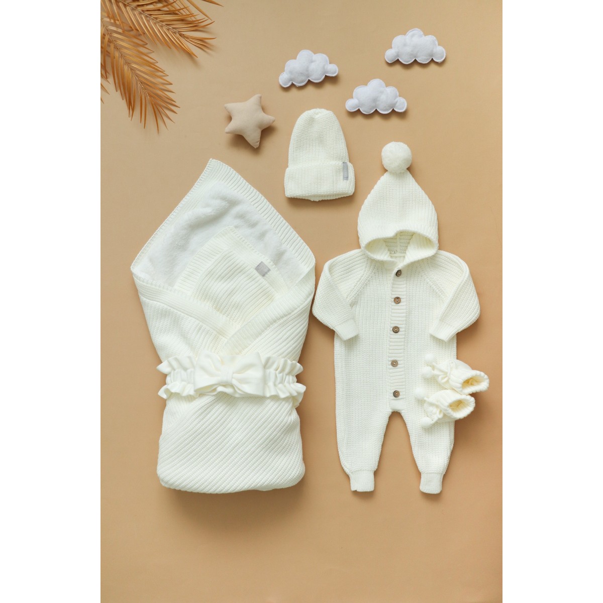 Комплект- палочка выручалочка . В нем все продумано, вязаный пледик утеплен мягкой шерпой. В комплекте есть все, что можно использовать на выписку, а после все товары из комплекта используются на прогулки и каждый день