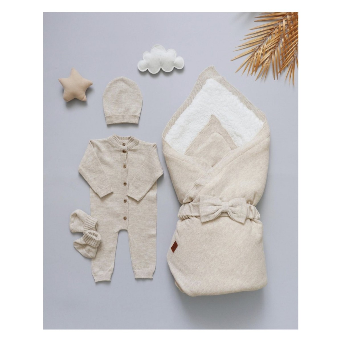 Мягкий практичный комплект на выписку из вязанного полотна (шерсть 50%, ПАН 50%) . Плед одеяло на мягкой подкладке из меховушки, утеплен альполюксом. На выписке будет стильным украшением, а в дальнейшем будет согревать кроху на прогулке.