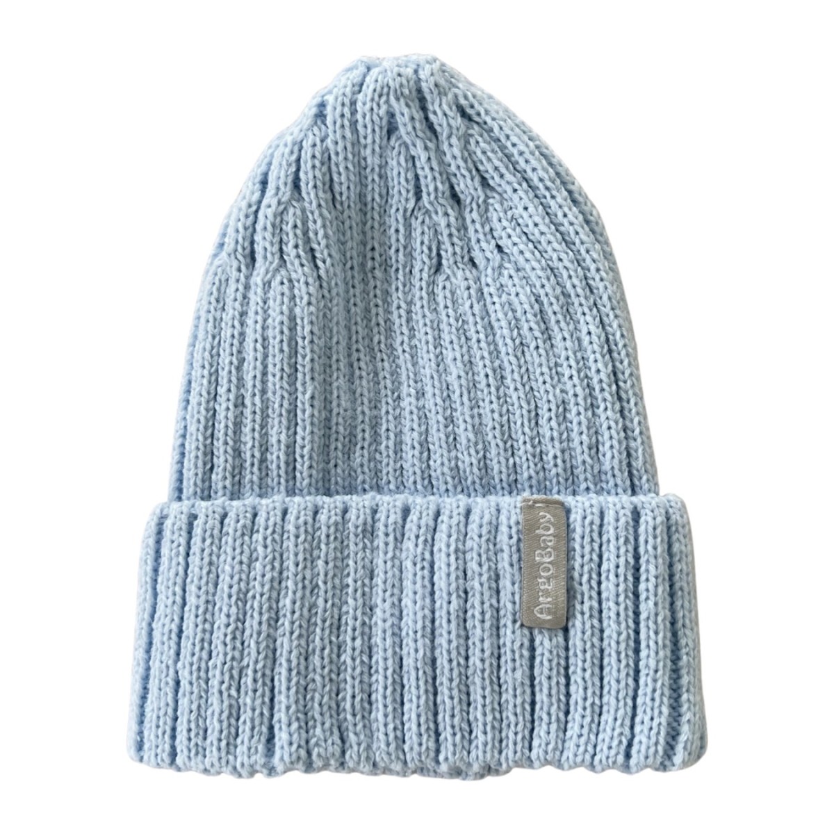 Вязаная шапочка хорошо тянется, но при этом сохраняет форму и отлично садится по голове малыша.