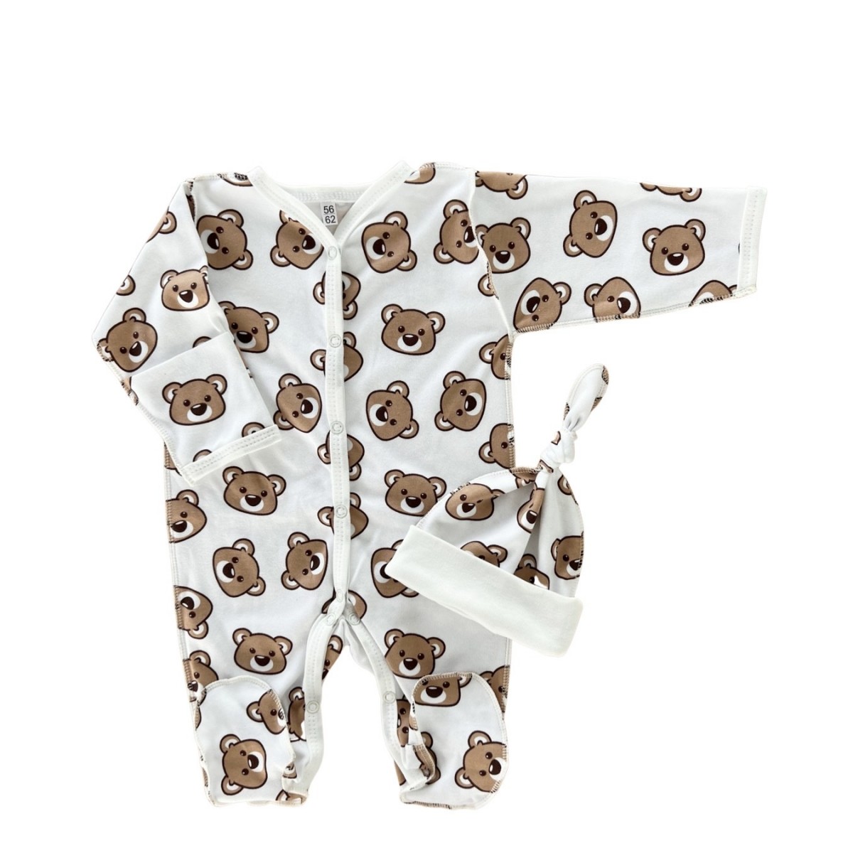Комплект: Слип на кнопках + шапочка-узелок со швами наружу 56-62 см "Мишки Teddy шоколадные" Т-097