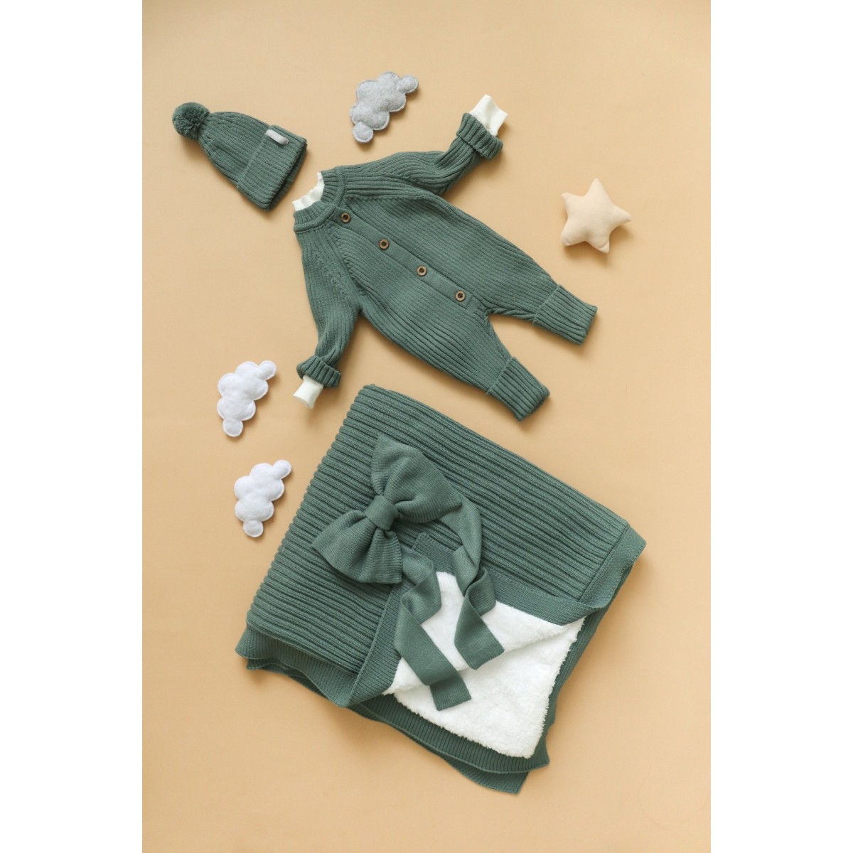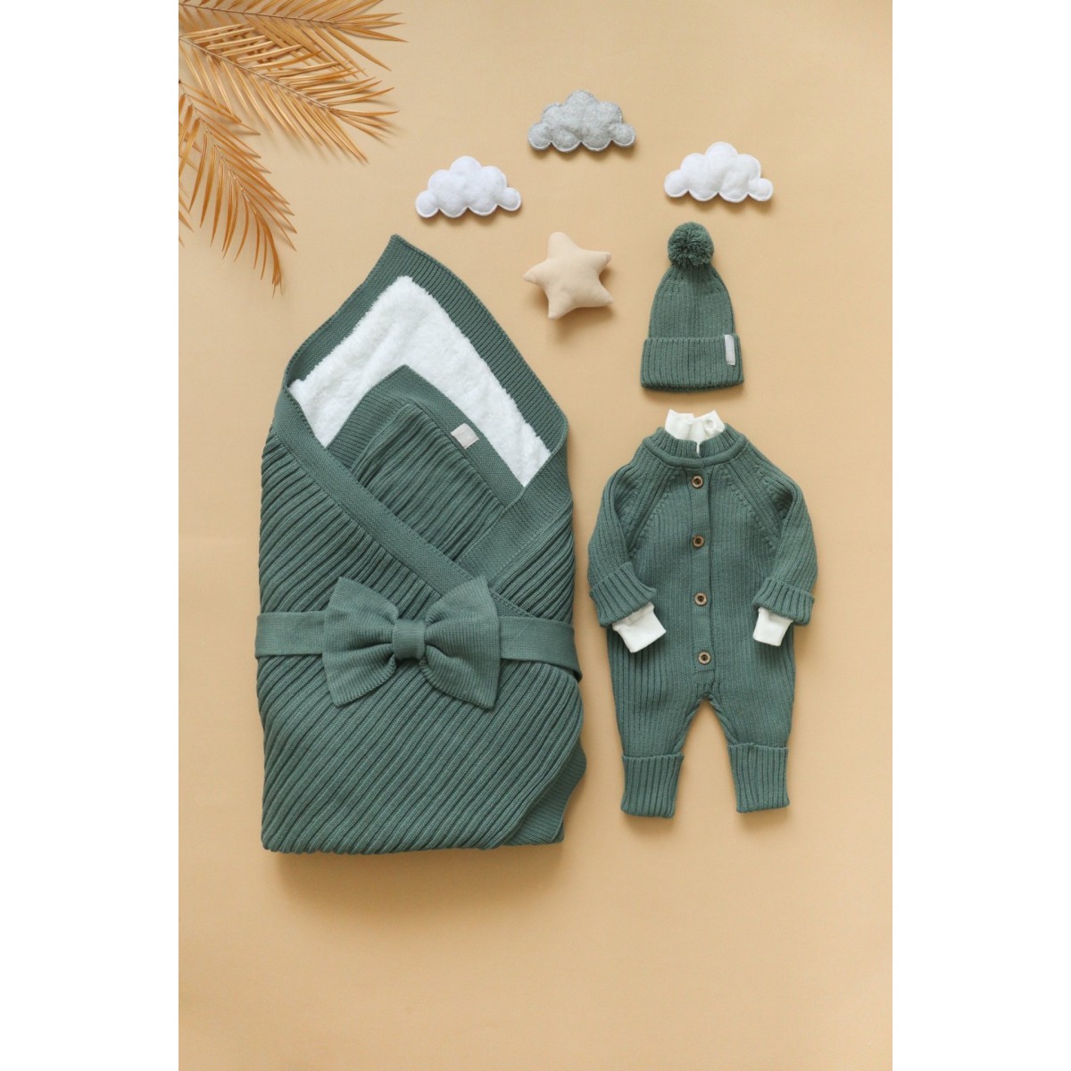 Красивое вязаное полотно на пледе с одной стороны, мягкая шерпа с другой стороны. В тон подобраны вязаный комбинезон, шапочка, носочки и пояс-бант для фиксации конвертика.