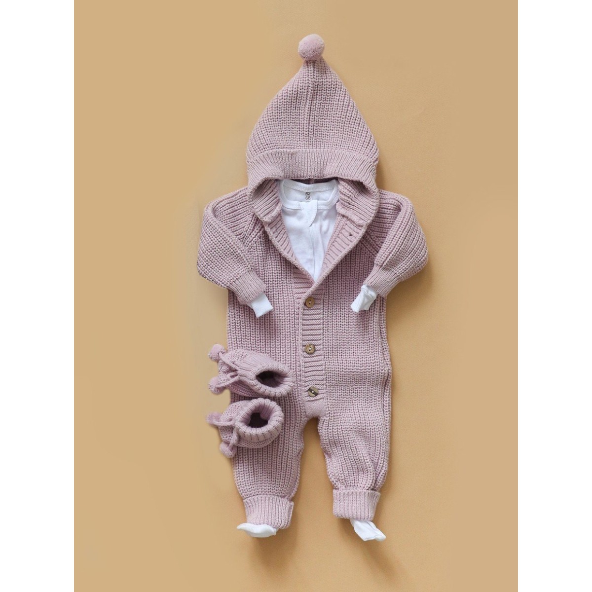 Стильный вязаный комбинезон для малыша с капюшоном.