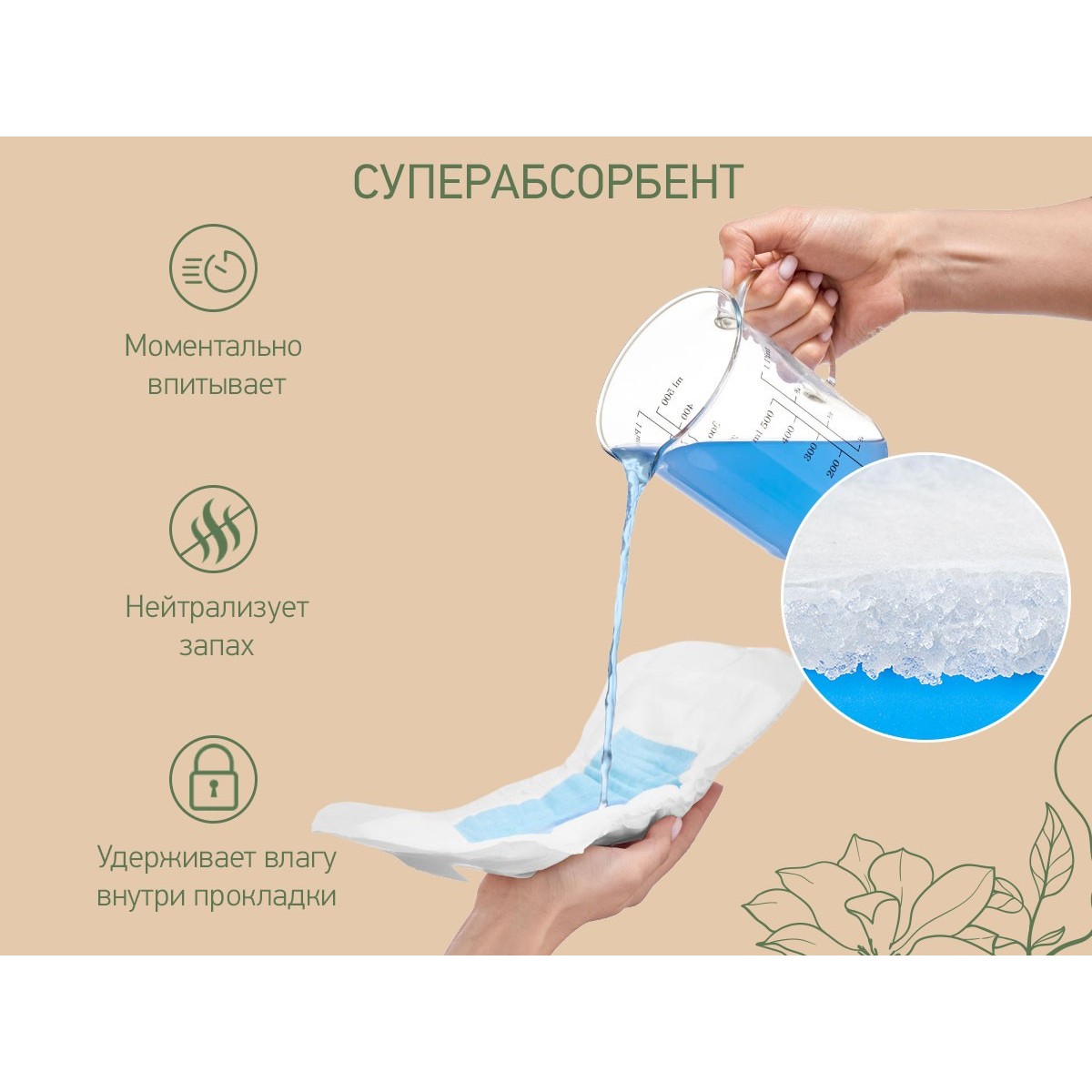 Суперабсорбент моментально превращает жидкость в гель и нейтрализует запах, а эластичные бортики по краям прокладки предотвращают протекание. Клеевой слой обеспечивает надежную фиксацию без сдвигов и скручиваний и позволяет легко закрепить прокладку как на одноразовых трусах, так и на обычном хлопковом белье.