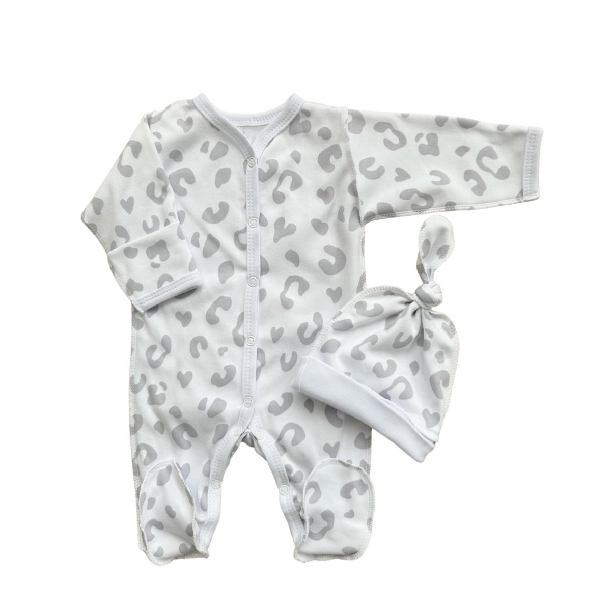 Комплект: Слип на кнопках + шапочка-узелок со швами наружу 56-62 см " Пятнышки серые" Т-097