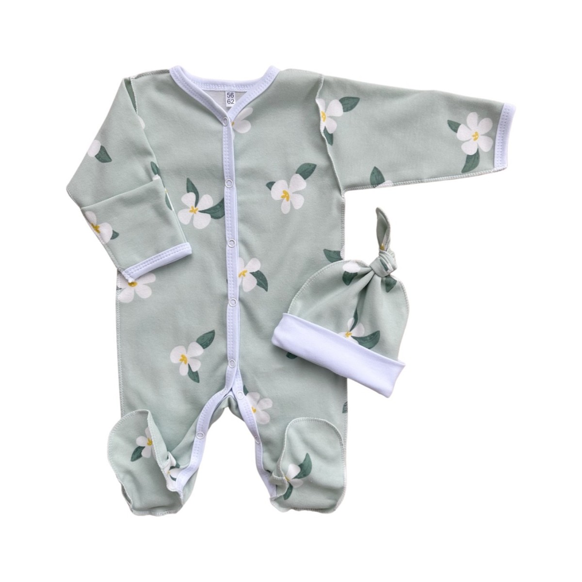 Комплект: Слип на кнопках + шапочка-узелок со швами наружу 56-62 см " Цветочки на мятном" Т-097
