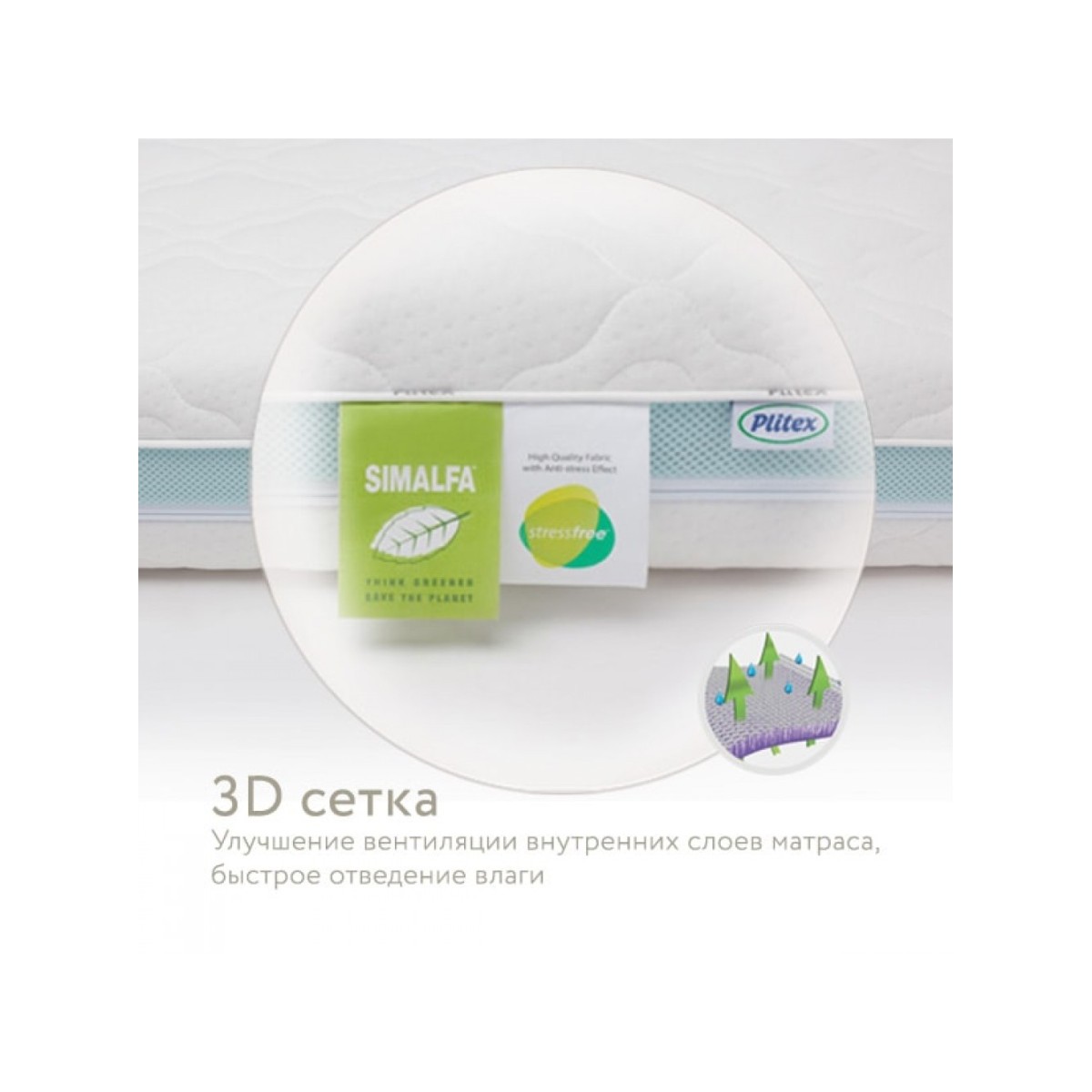 -Чехол матраса – двухслойный, прочный трикотажный материал StressFree. Верхний слой StressFree – 100% хлопок высшего качества; нижний слой – пористый, дышащий. Плотная стежка делает чехол воздушным. Ткань обладает антистатичскими свойствами, которые сохраняются после стирки. А специальная 3D сетка по периметру матраса создает дополнительную вентиляцию.