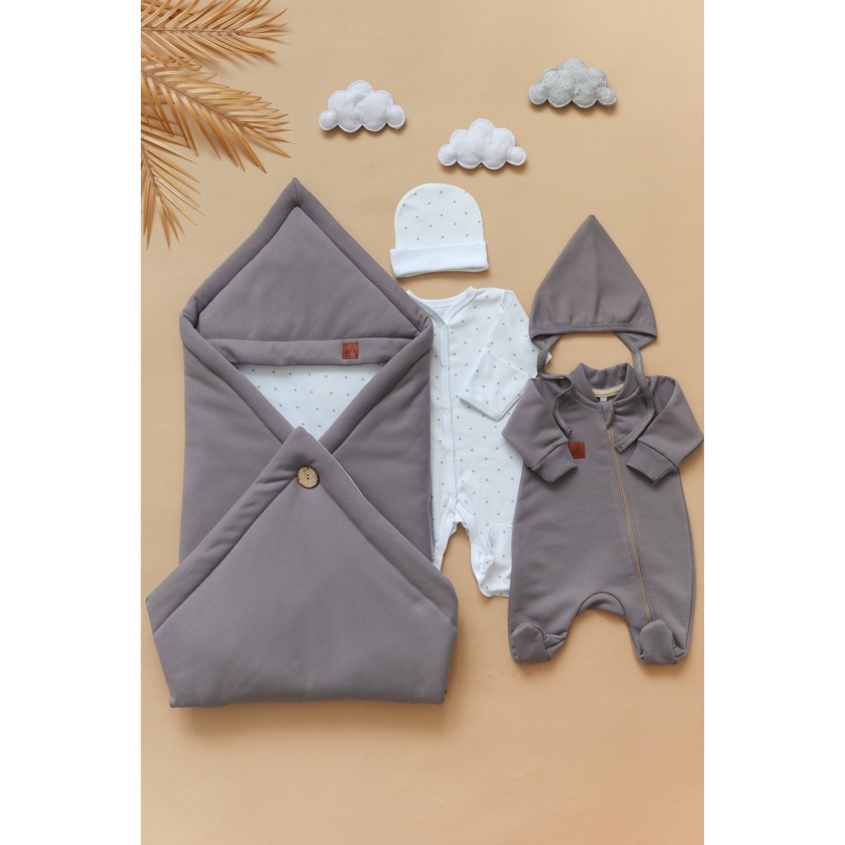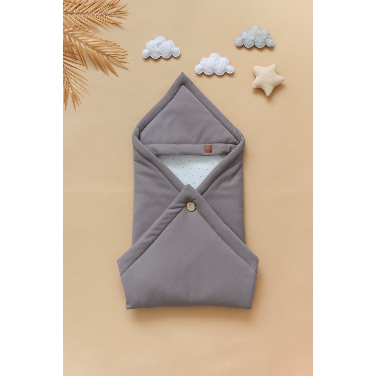 Одеяло легко трансформируется в конверт, фиксируясь на стильную крупную пуговицу. Конвертик хорошо держит форму, а еще его можно сложить несколькими способами, меняя образ. Уголок на конверте защитит головку малыша от ветра, а двустороннее одеяло всегда пригодится в кроватке или коляске.