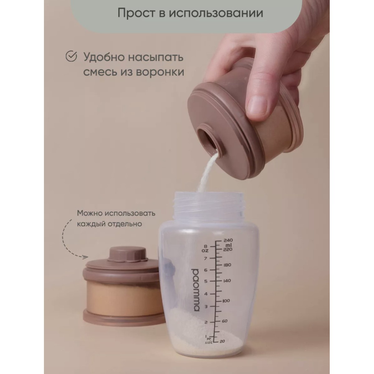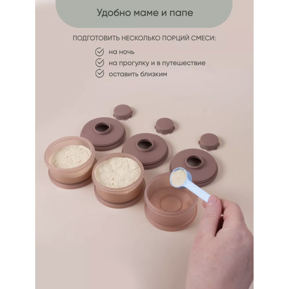 Контейнер для детского питания состоит из 3 отделений. Каждое отделение имеет специальную воронку с крышкой, что позволяет каждое отделение использовать отдельно и легко высыпать смесь в бутылочку. Контейнер удобно брать с собой в дорогу или подготовить несколько порций смеси для кормления на ночь. Широкий носик обеспечивает легкое и полное высыпание смеси из всех трёх отсеков. Крышка надежно закрывается. Каждый отсек контейнера вмещает 3 мерных ложки, 90 гр молочной смеси - отличный дозатор для детской смеси на улице, в гостях, ночью.