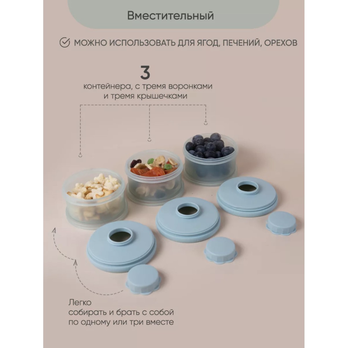 Контейнер для детского питания состоит из 3 отделений. Каждое отделение имеет специальную воронку с крышкой, что позволяет каждое отделение использовать отдельно и легко высыпать смесь в бутылочку. Контейнер удобно брать с собой в дорогу или подготовить несколько порций смеси для кормления на ночь. Широкий носик обеспечивает легкое и полное высыпание смеси из всех трёх отсеков. Крышка надежно закрывается. Каждый отсек контейнера вмещает 3 мерных ложки, 90 гр молочной смеси - отличный дозатор для детской смеси на улице, в гостях, ночью.