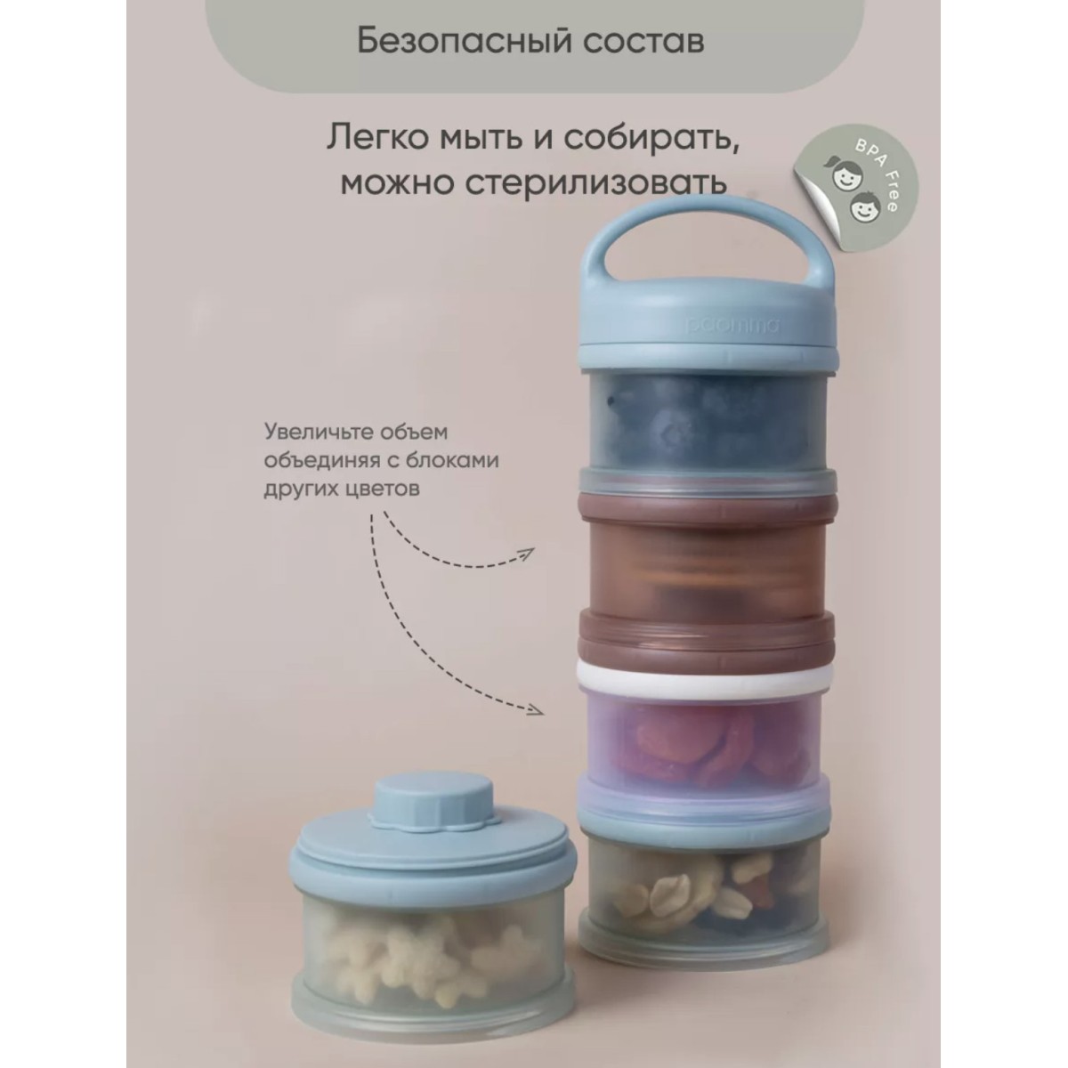 Изготовлен из 100% полипропилена, не содержит бисфенола А, ПВХ и фталатов и не взаимодействует с пищевыми продуктами, что делает его безопасным для использования в детском питании.