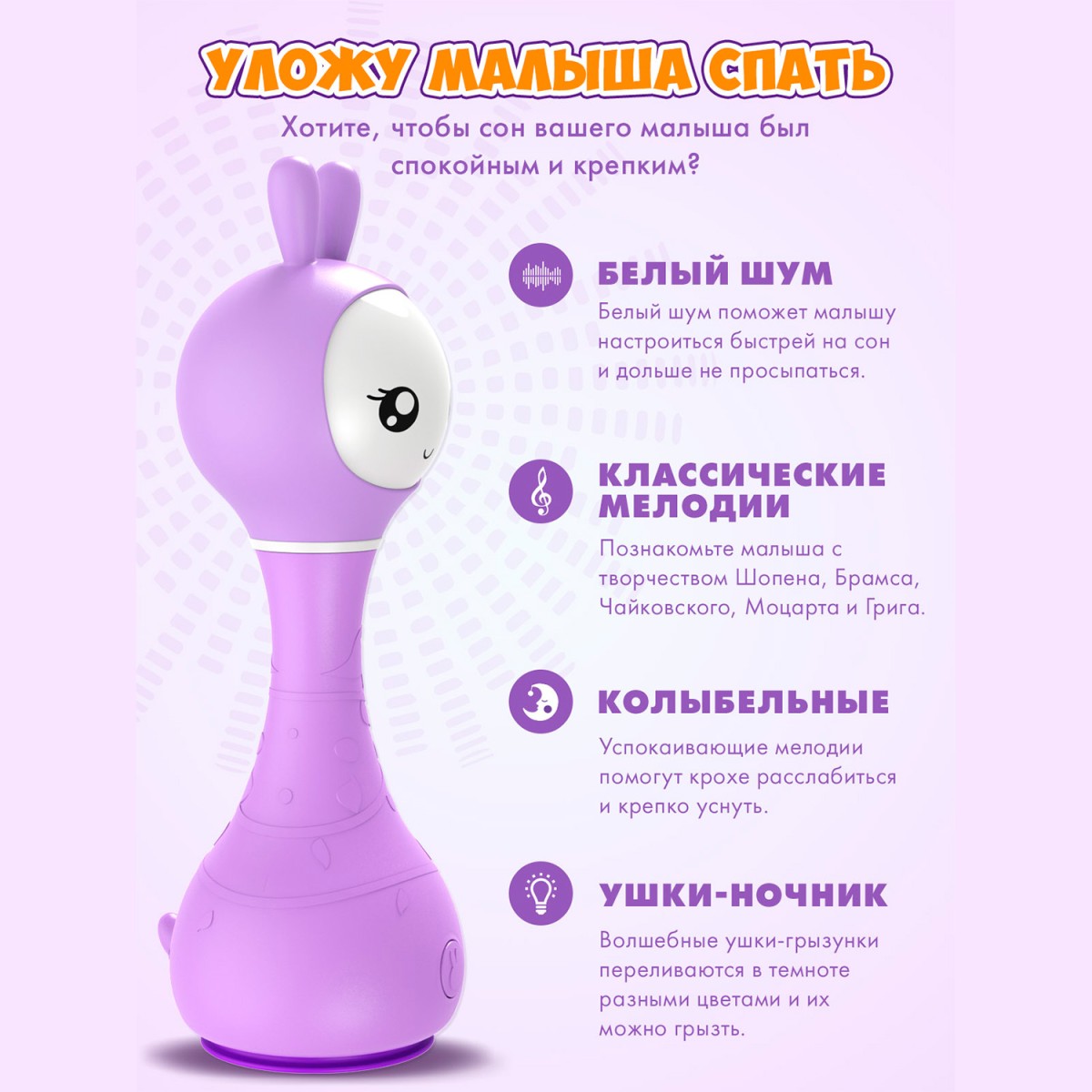 • ВОЛШЕБНЫЕ УШКИ. Они сделаны из мягкого и безопасного силикона и переливаются в темноте разными цветами. Но я не просто ночник, мои мягкие ушки можно грызть.