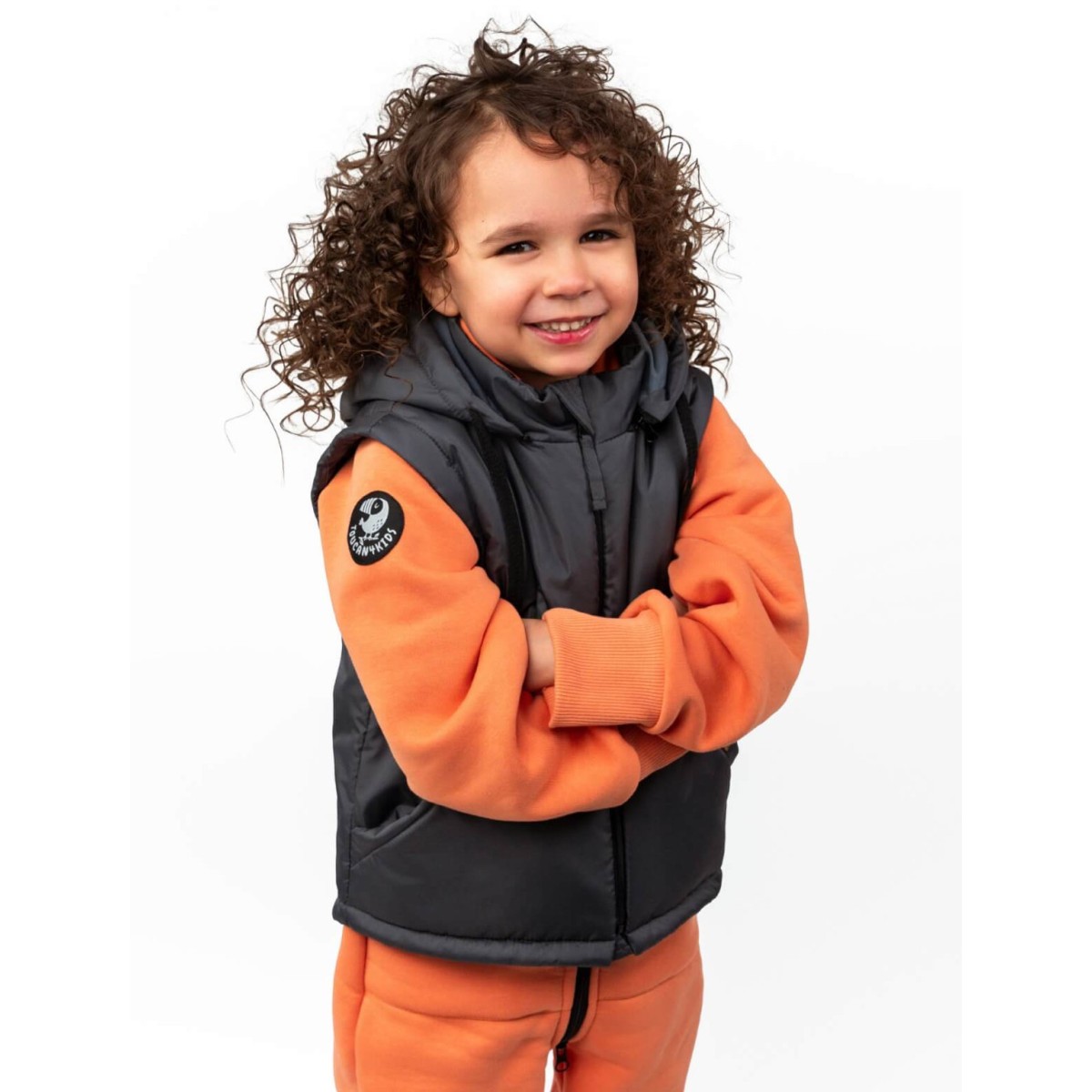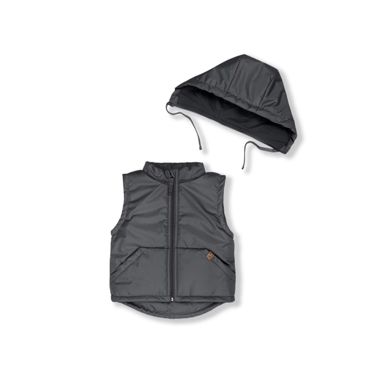 Удобная демисезонная жилеточка со съемным капюшоном. Спаренный размер позволяет носить такую жилетку не один сезон.