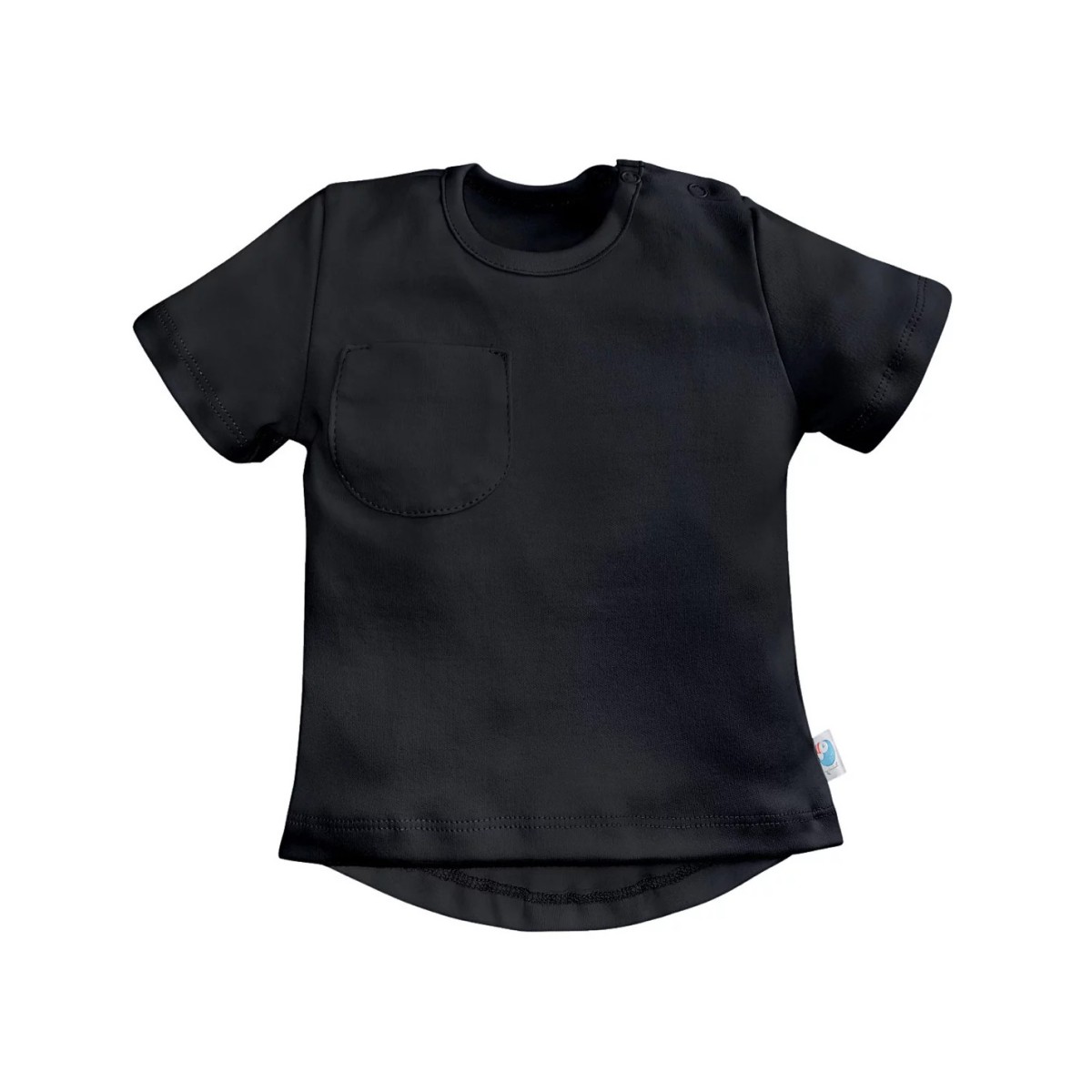 Футболка с коротким рукавом, удлиненной спинкой и карманом на груди. Две кнопки на плече для удобства одевания.