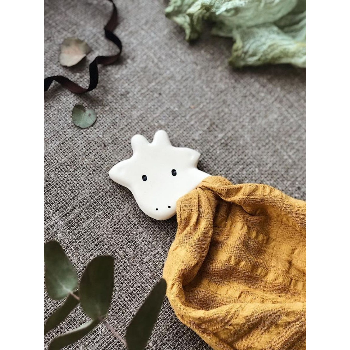 Прорезыватель-платочек сделан из органических материалов: органический хлопок и натуральный каучук.