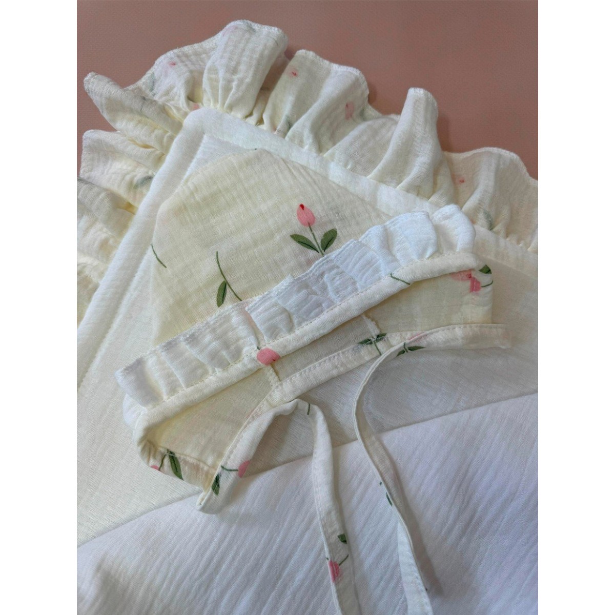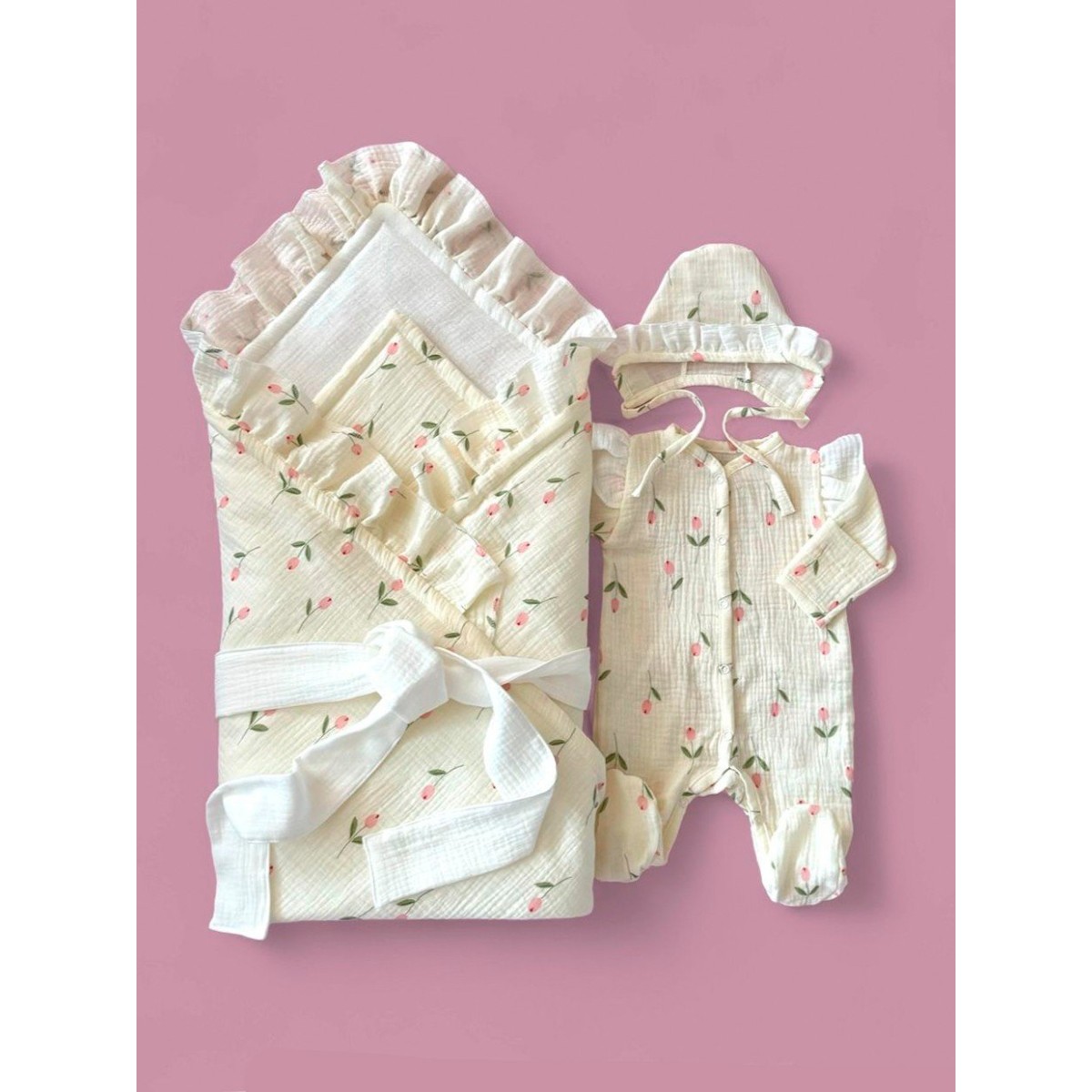 Муслиновый комплект на выписку и прогулки 4 предмета цвет: тюльпаны 0404/молочно-розовый