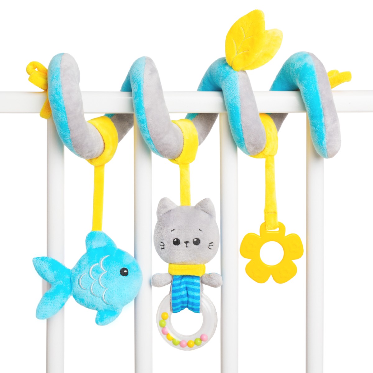 Мягкая развивающая игрушка-подвеска с погремушкой Игрушка-подвеска «Котенок Кекс» создана не только для первых игр с ребенком, но и для его развития. Подвеска занимает внимание малыша и способствует его развитию с первых месяцев, так как сочетает в себе несколько игрушек сразу: две детские погремушки разного типа и прорезыватель для зубов, которые прикреплены к спирали-змейке. Погремушки помогут ребенку развить слух и мелкую моторику рук. Яркие цвета игрушки поспособствуют развитию концентрации, а грызунок облегчит прорезываение зубов. Игрушка-подвеска легко крепится на детское автокресло, кроватку для новорожденного или коляску, а любую из игрушек можно снять и использовать для игр с малышом отдельно, что делает спираль-подвеску универсальной в использовании. Подвеска также станет отличным вариантом игрушки в дорогу. Симпатичная и интересная игрушка выполнена из безопасных материалов, поэтому она не только полезна в развитии малыша, но и безопасна в использовании. Игрушка-подвеска «Котенок Кекс» выполнена из качественных износостойких материалов, поэтому ваш ребенок смело может крутить, трясти или грызть ее. Развивающая игрушка — это отличный подарок на день рождения ребенка. Малыш будет с удовольствием играть с подвеской-спиралью вместе с вами с грудничкового возраста. Самостоятельное использование от 1+