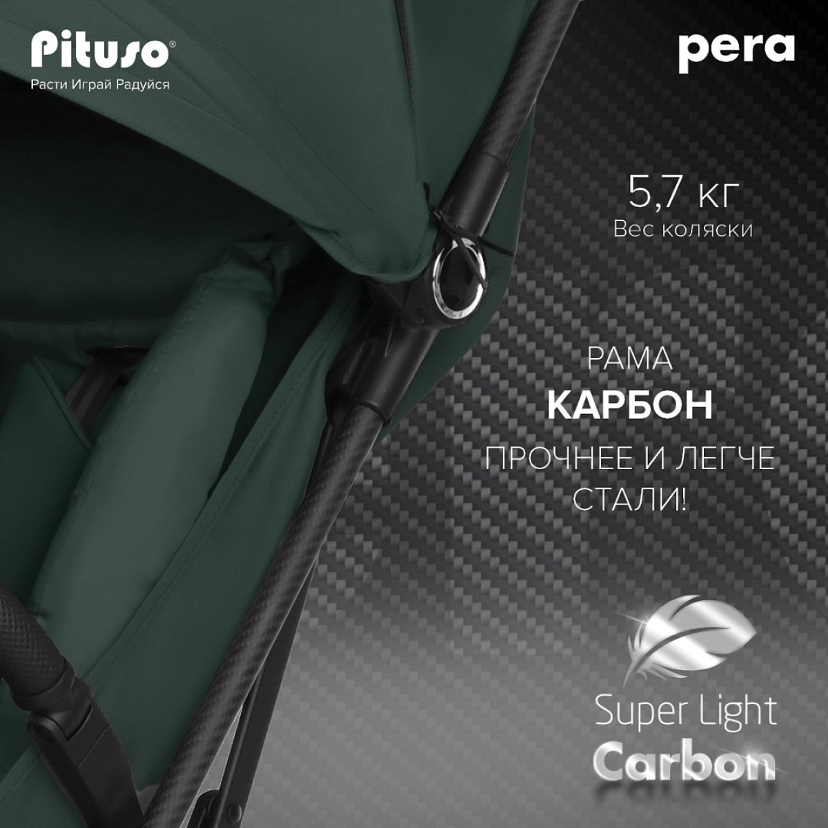 Благодаря прочной конструкции из карбона (а он гораздо прочнее и легче стали!) и надежному шасси детская коляска PITUSO PERA может использоваться как универсальная коляска. Хорошая проходимость, качественная амортизация с дополнительной системой ANTISHOCK на передних колесах и повышенная маневренность.