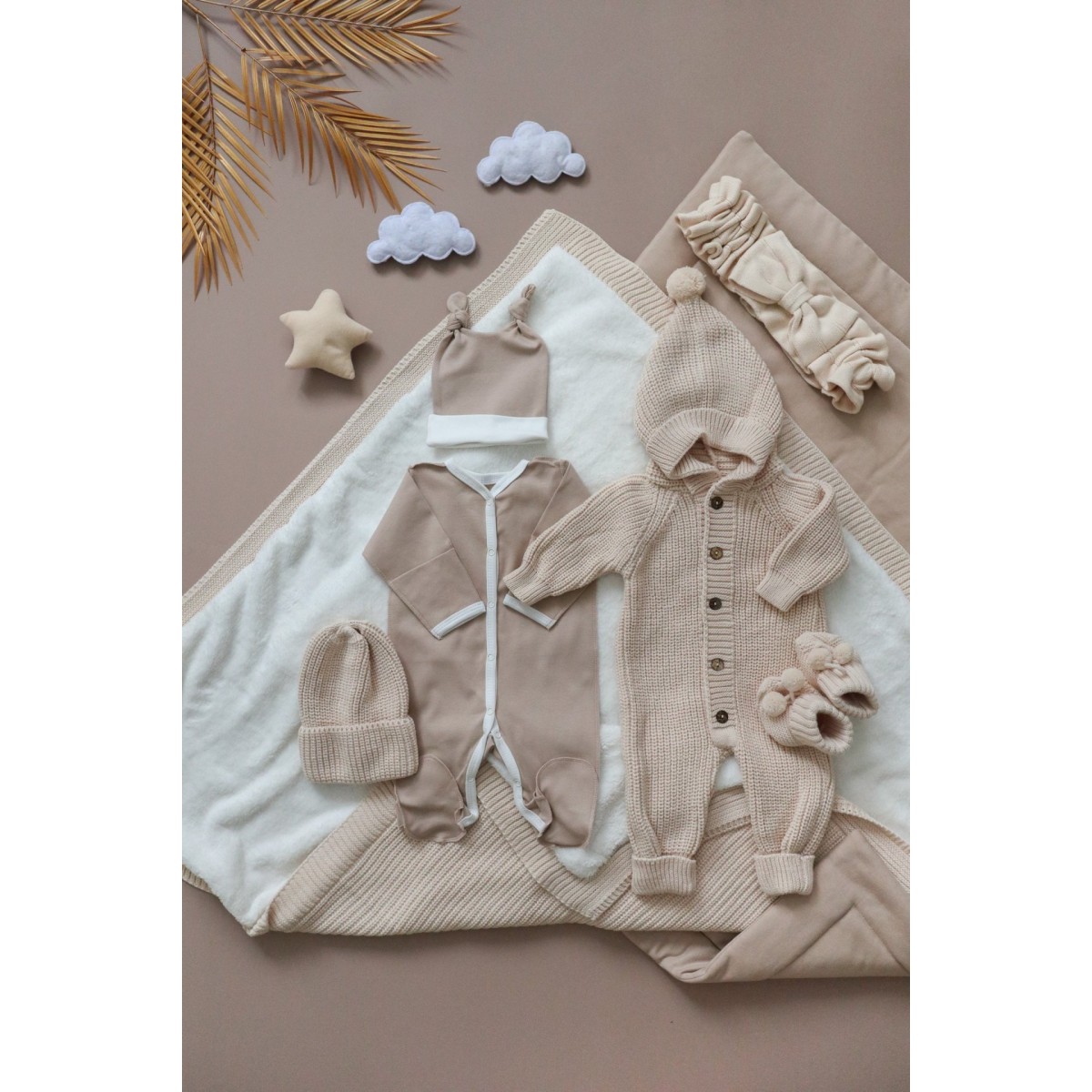 -вязаный комбинезон на пуговицах с капюшоном, можно регулировать по росту за счет мягких манжетов. (56-68 см, с рождения до 6 месяцев)