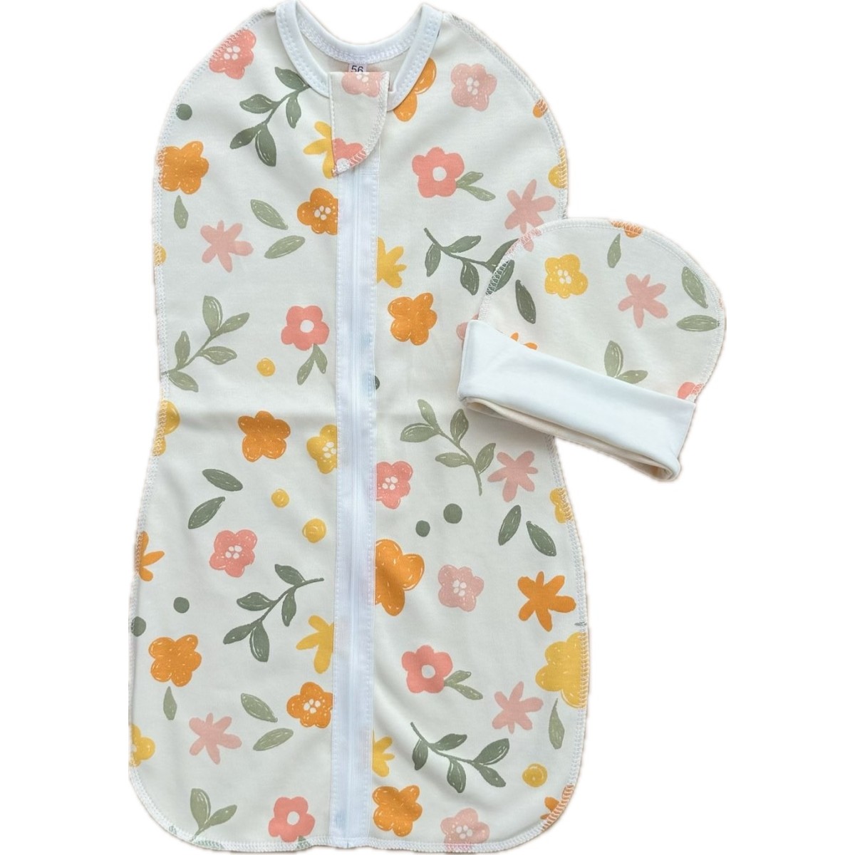Пеленка-кокон на молнии с шапочкой 56-62 см принт: цветочки оранжевые Т-007