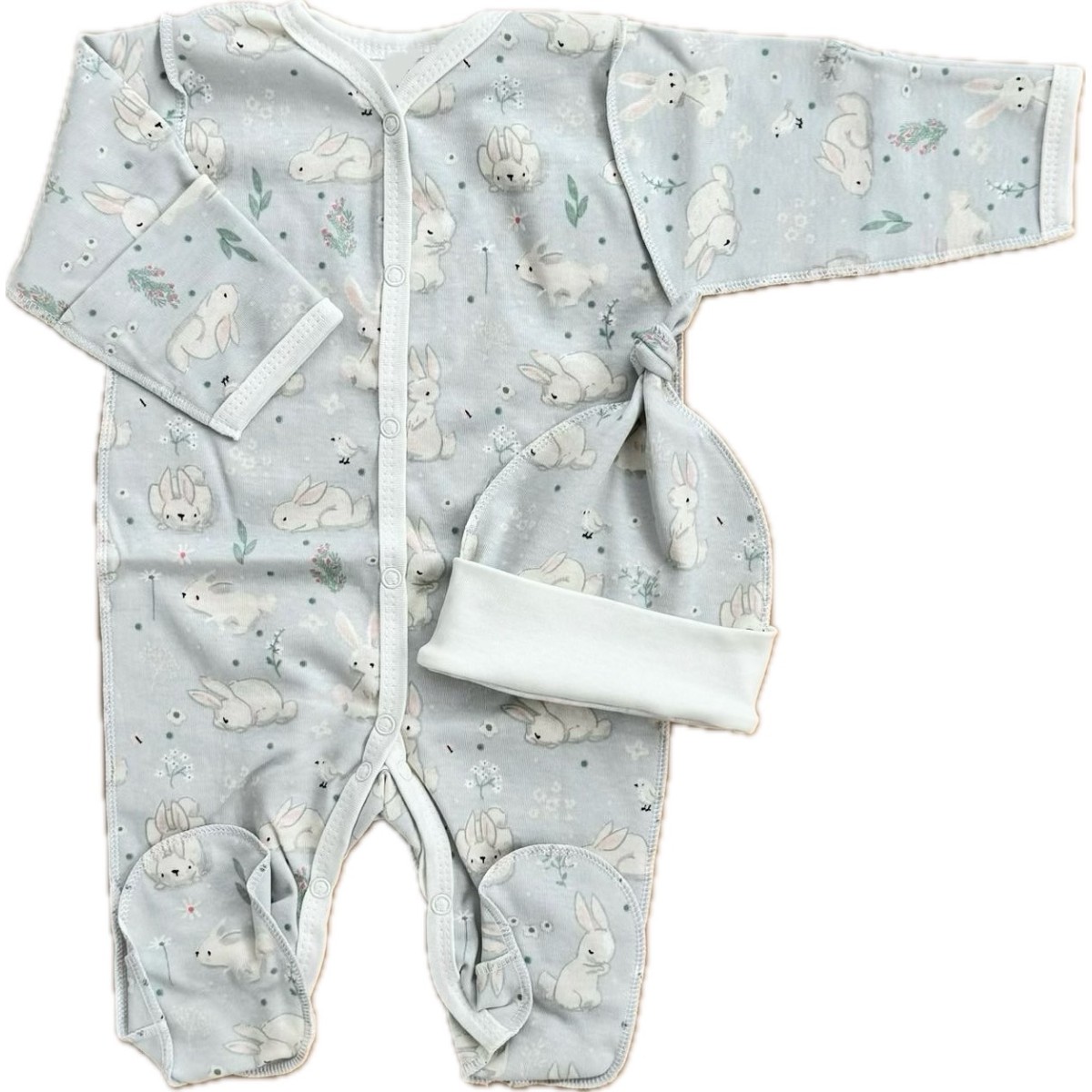 Комплект: Слип на кнопках + шапочка-узелок со швами наружу 50 см Newborn "Зайки на голубом" Т-097