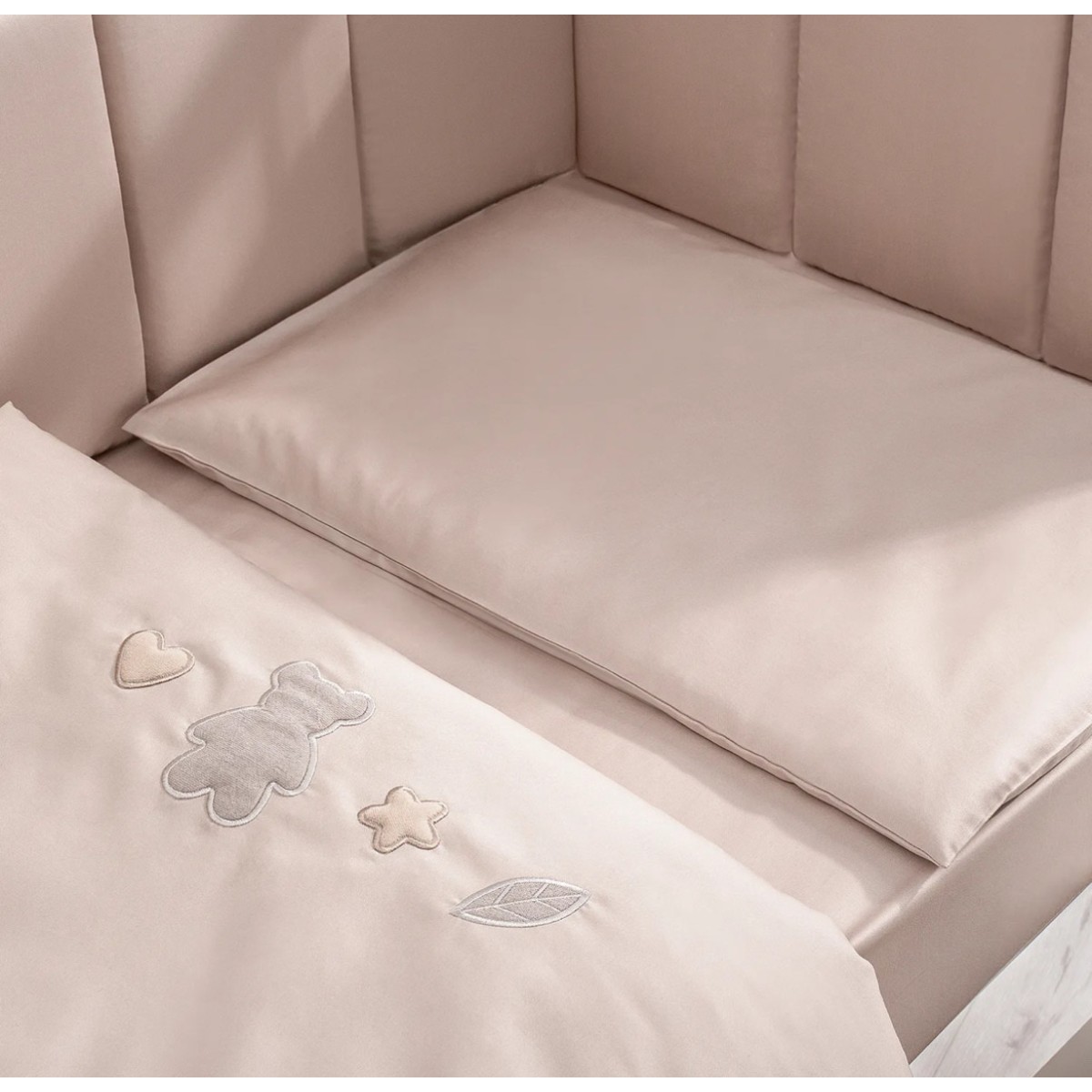 Дизайн комплекта продуман до мелочей. После пробуждения малыш наверняка будет с интересом рассматривать и трогать рисунки на пододеяльнике, выполненные в виде переливающейся и приятной на ощупь вышивки.