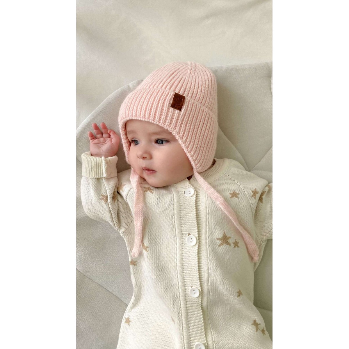 Красивая стильная вязаная шапочка из импортного мериноса. Хорошая посадка по голове малыша, хлопковая подкладка внутри шапочки позволяет носить ее не поддевая чепчик или хлопковую шапочку. Модель идет с завязками.