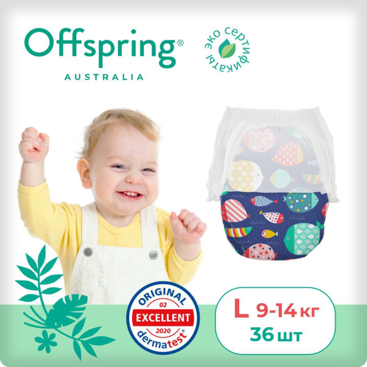 Эко-подгузники-трусики Offspring L 9-14 кг 36 шт цвет: рыбки