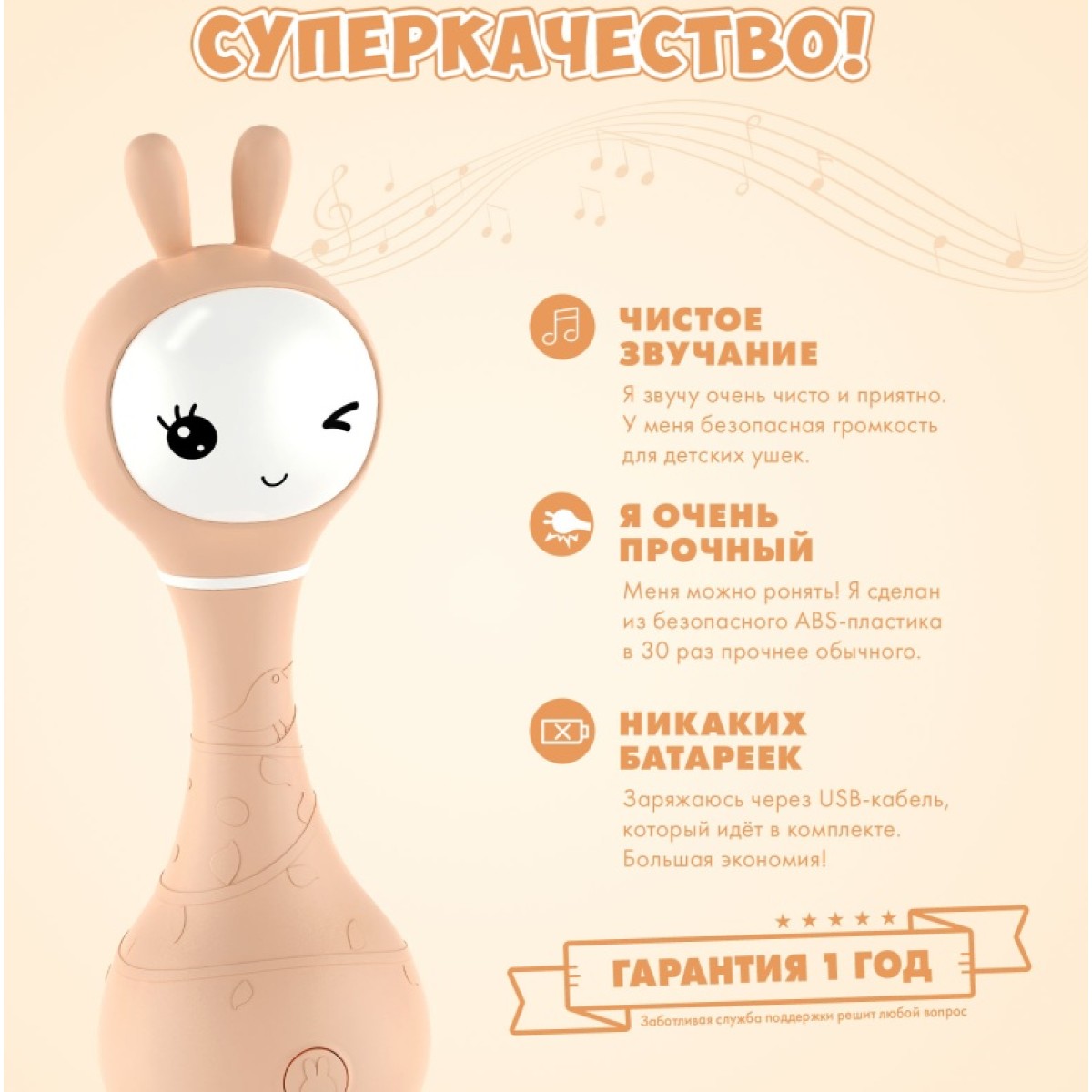 • ВОЛШЕБНЫЕ УШКИ. Они сделаны из мягкого и безопасного силикона и переливаются в темноте разными цветами. Но я не просто ночник, мои мягкие ушки можно грызть.