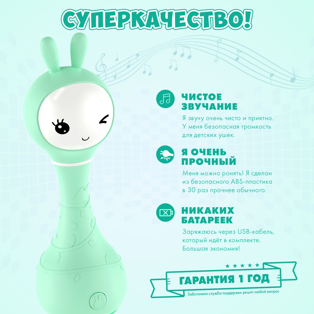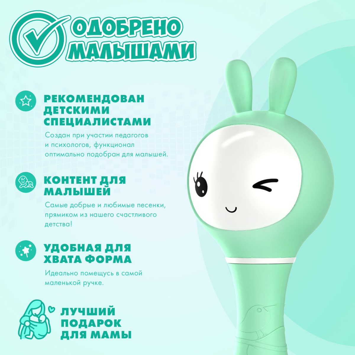 Интерактивная игрушка-погремушка Умный зайка alilo R1 c распознаванием цветов цвет: мятный 60348