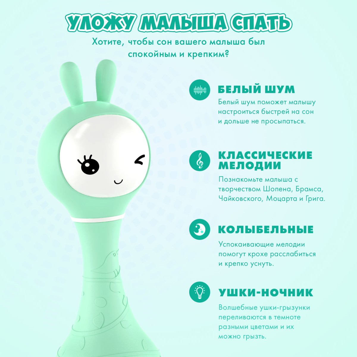 • ВОЛШЕБНЫЕ УШКИ. Они сделаны из мягкого и безопасного силикона и переливаются в темноте разными цветами. Но я не просто ночник, мои мягкие ушки можно грызть.