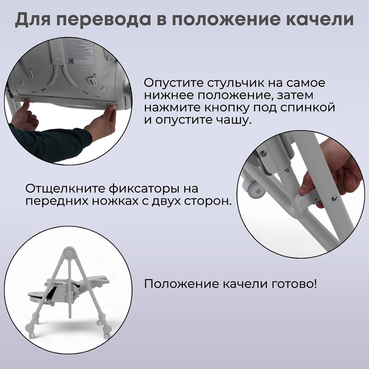Для того чтобы переключить стульчик в режим кресла-качалки необходимо установить высоту сиденья на самую низкую высоту. Нажмите на кнопку под спинкой и опустите сиденье. На передних ножках отщелкните фиксаторы и стульчик превратился в полноценные качели. Бесшумные качели не требуют электроэнергии и приводятся в действие механически.