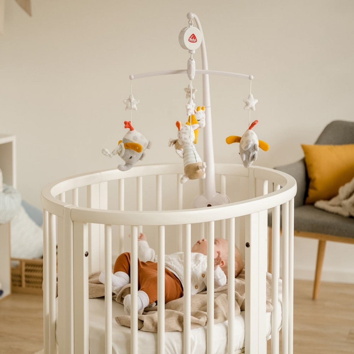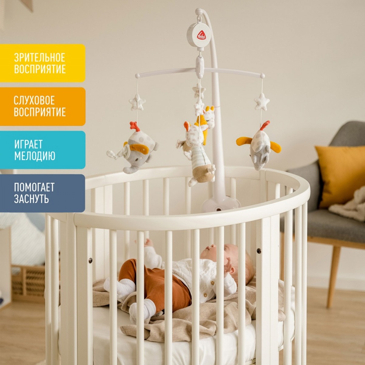 Мобиль легко и надежно крепится к кроватке. Слонёнок и жирафик медленно вращаются под мелодию, увлекая за собой взгляд малыша. Ребенку будет интересно разглядывать фигурки, тем самым стимулируя воображение и развивая концентрацию внимания.
