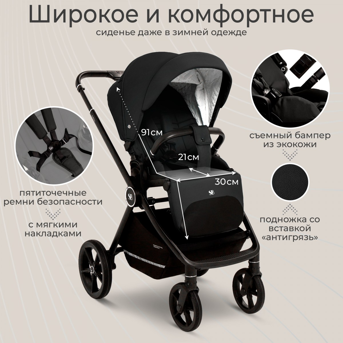 Просторное спальное место (91х30 см) создает идеальные условия для сна во время прогулок.