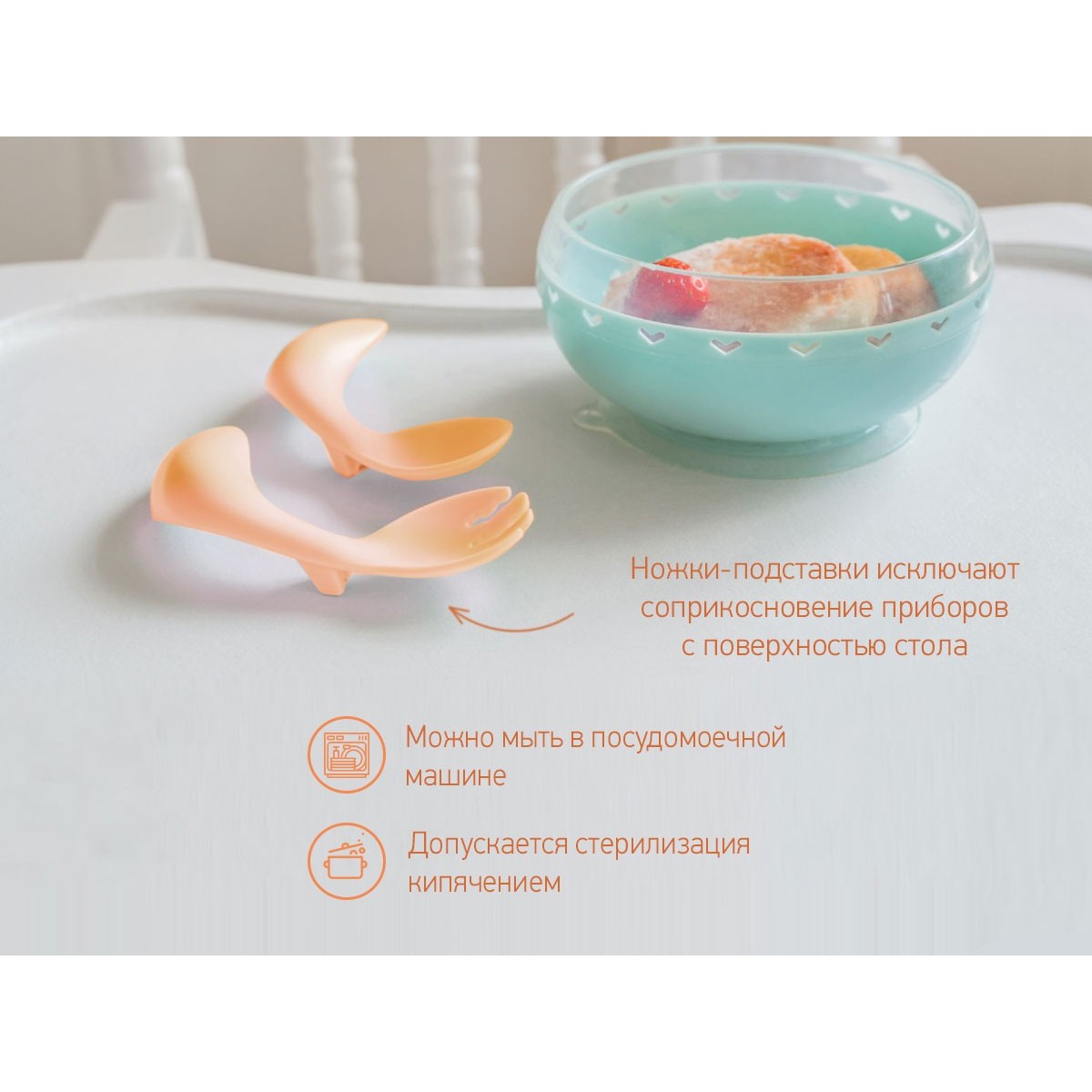 Специальные ножки-подставки обеспечивают гигиеничное использование и исключают соприкосновение ложки и вилки с поверхностью стола.
