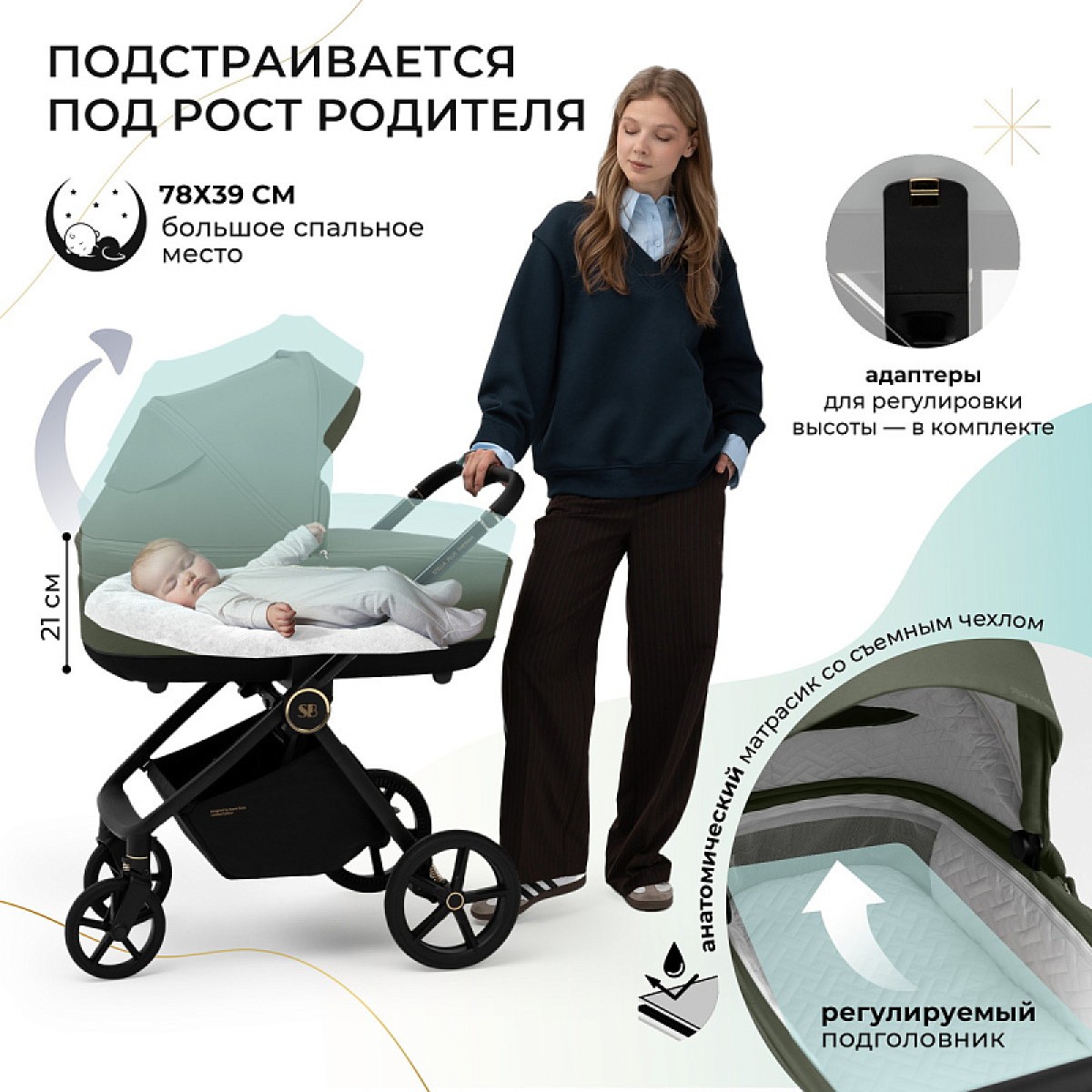Телескопическая ручка коляски подстраивается под любой рост родителей, обеспечивая интуитивное управление без лишних усилий.